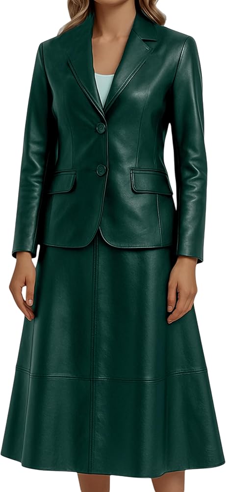 Premium Genuine Leather Craftsmanship – This elegant women's skirt suit set features a fine lambskin leather blazer paired with a genuine leather skirt, offering timeless durability, luxurious feel, and a polished look for every occasion.