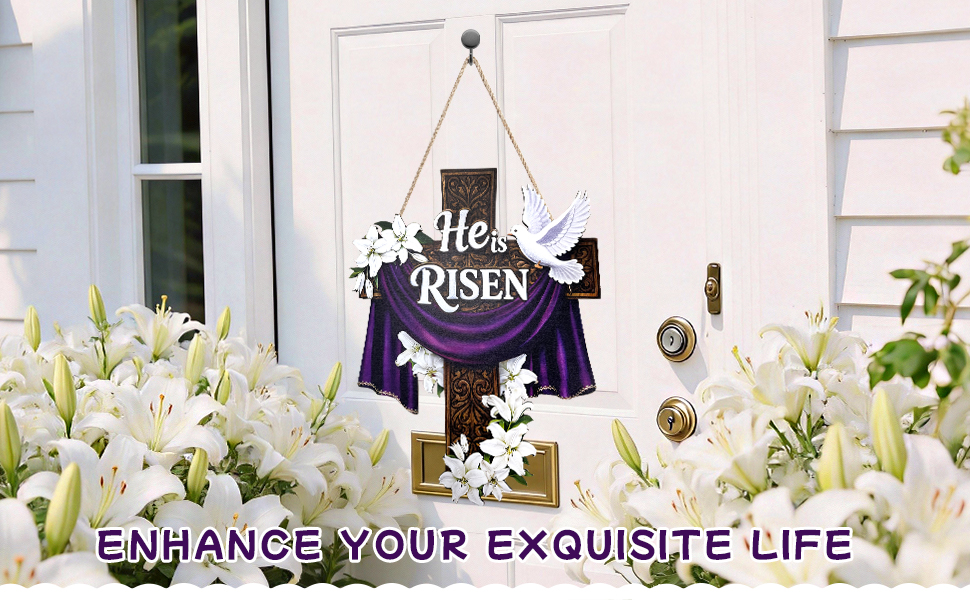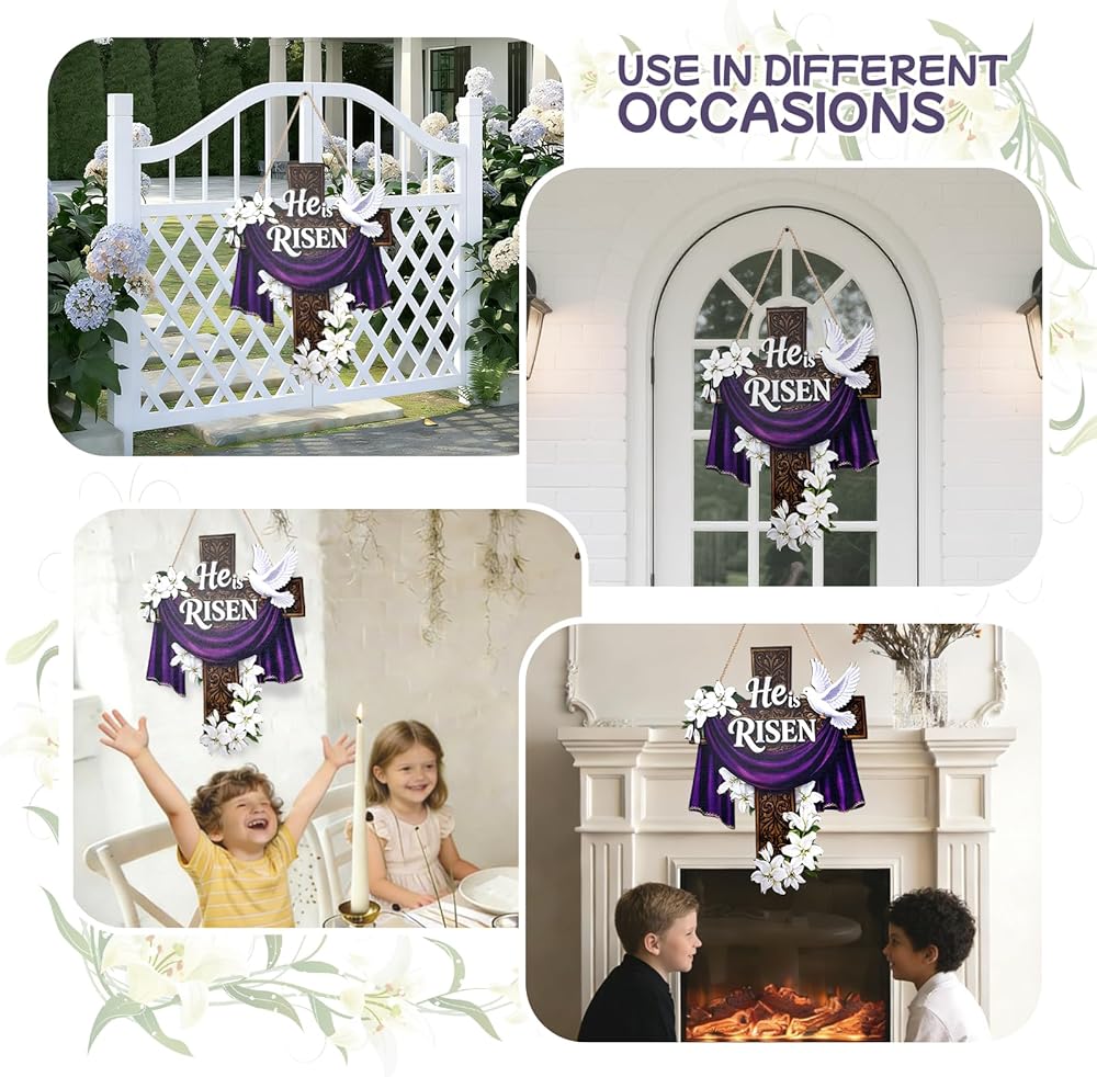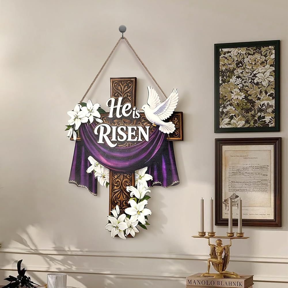 ⭐He Is Risen Easter Cross Door Decoration This wooden Easter door sign features a classic cross design with elegant lily flowers and the words “He Is Risen,” making it a meaningful religious Easter decoration for the spring season.