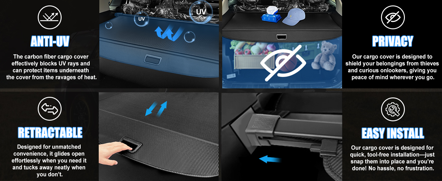 🚗 Premium Quality Material: Crafted from waterproof and durable carbon fiber with structural reinforcement, this cargo cover is resistant to tears and offers strong compressive strength. Additionally, it is easy to clean, retractable, and built to last.
