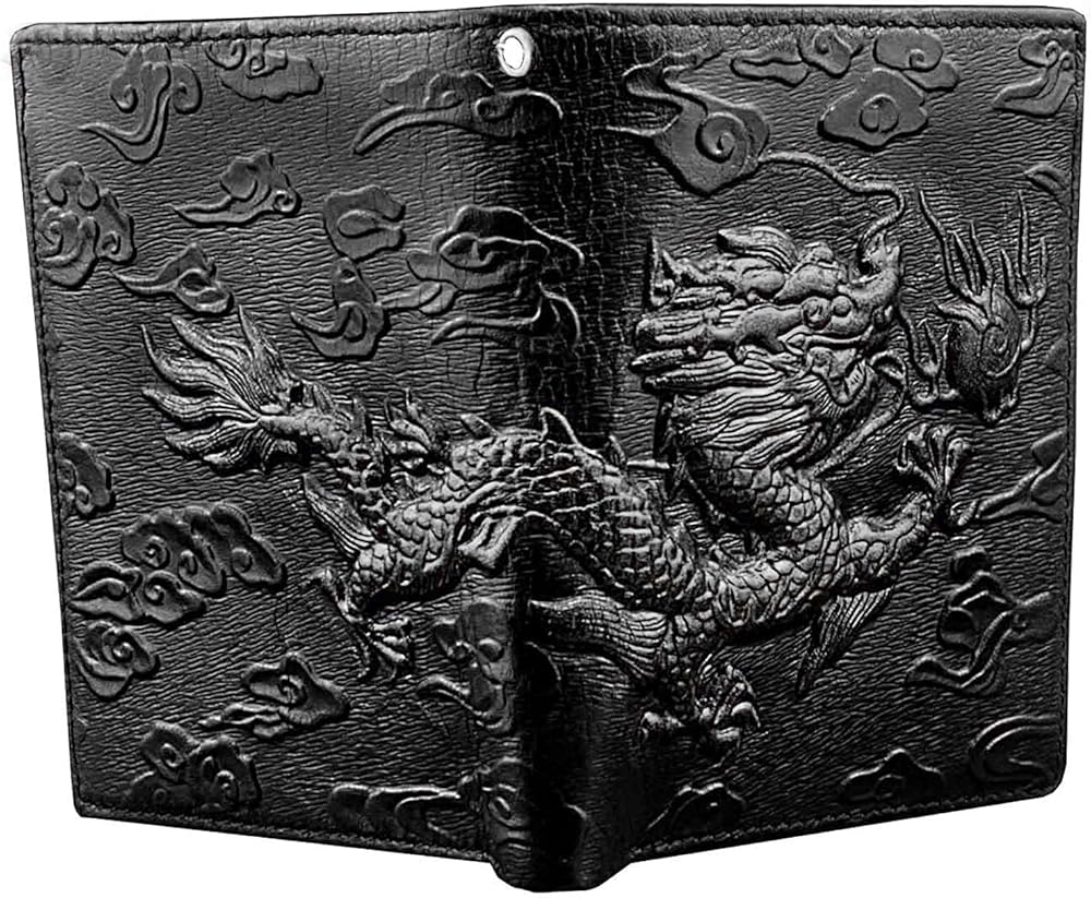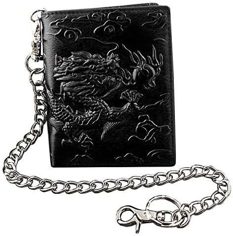 Balck Men Real Leather Vintage Dragon Wallet with Chain Card Holder Purse