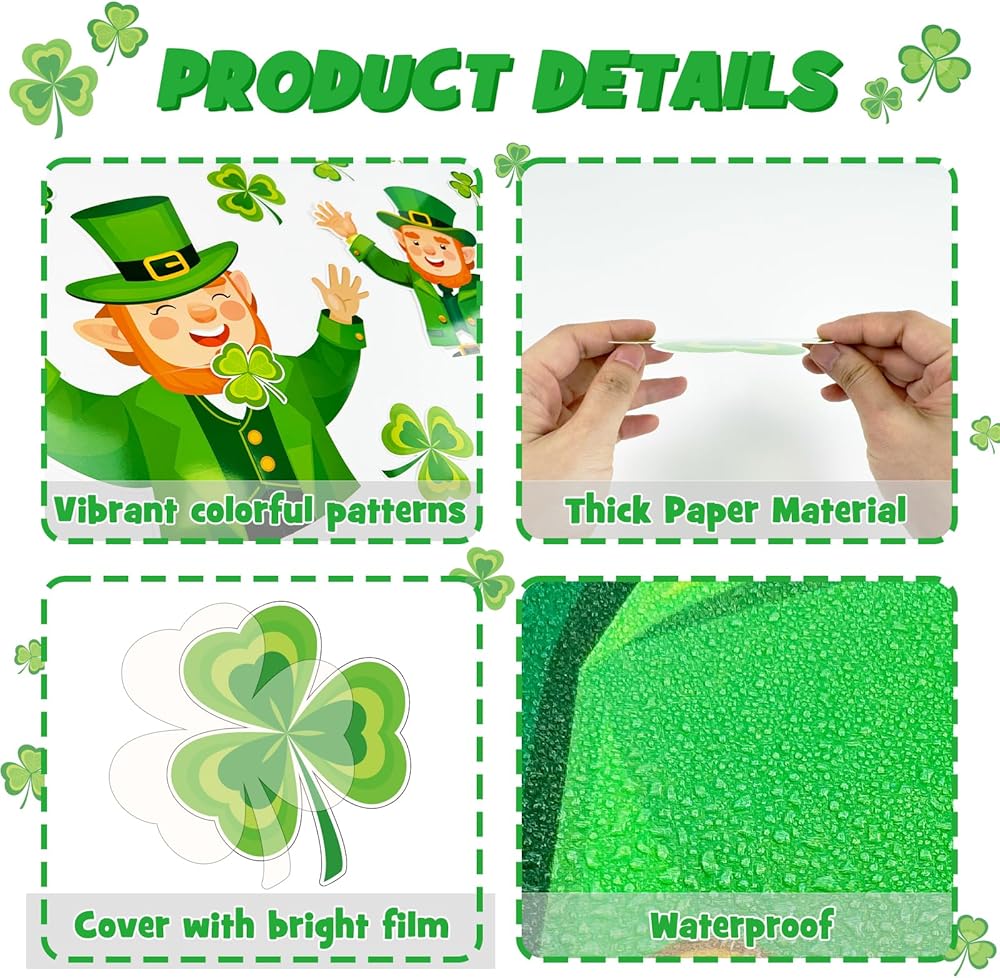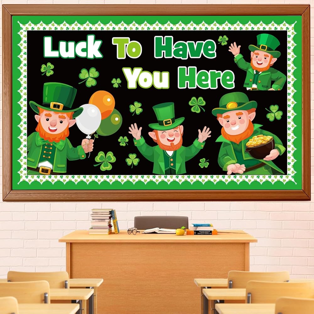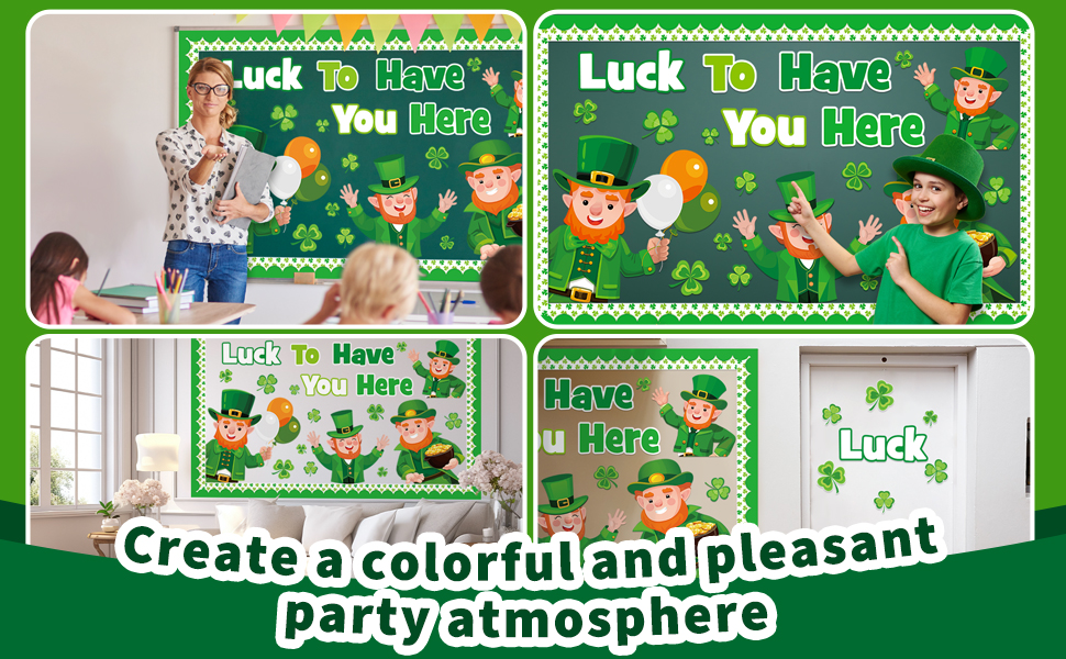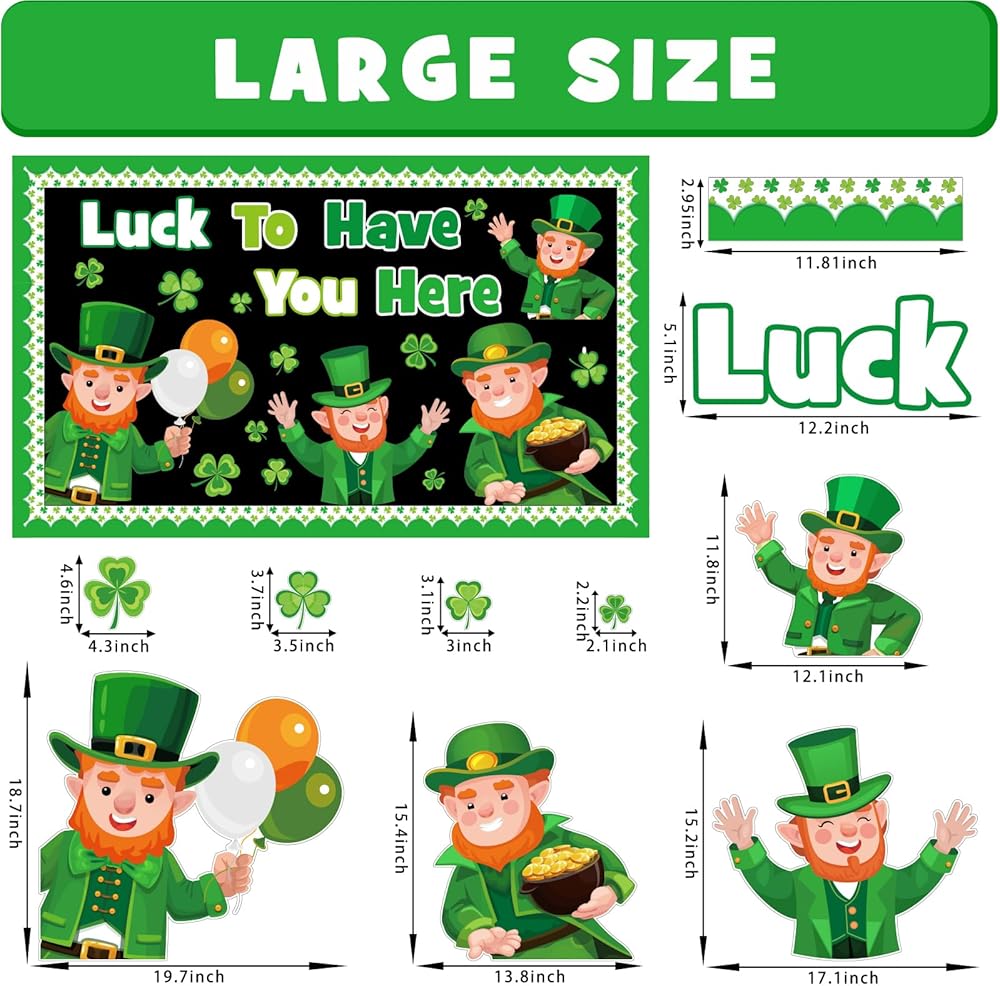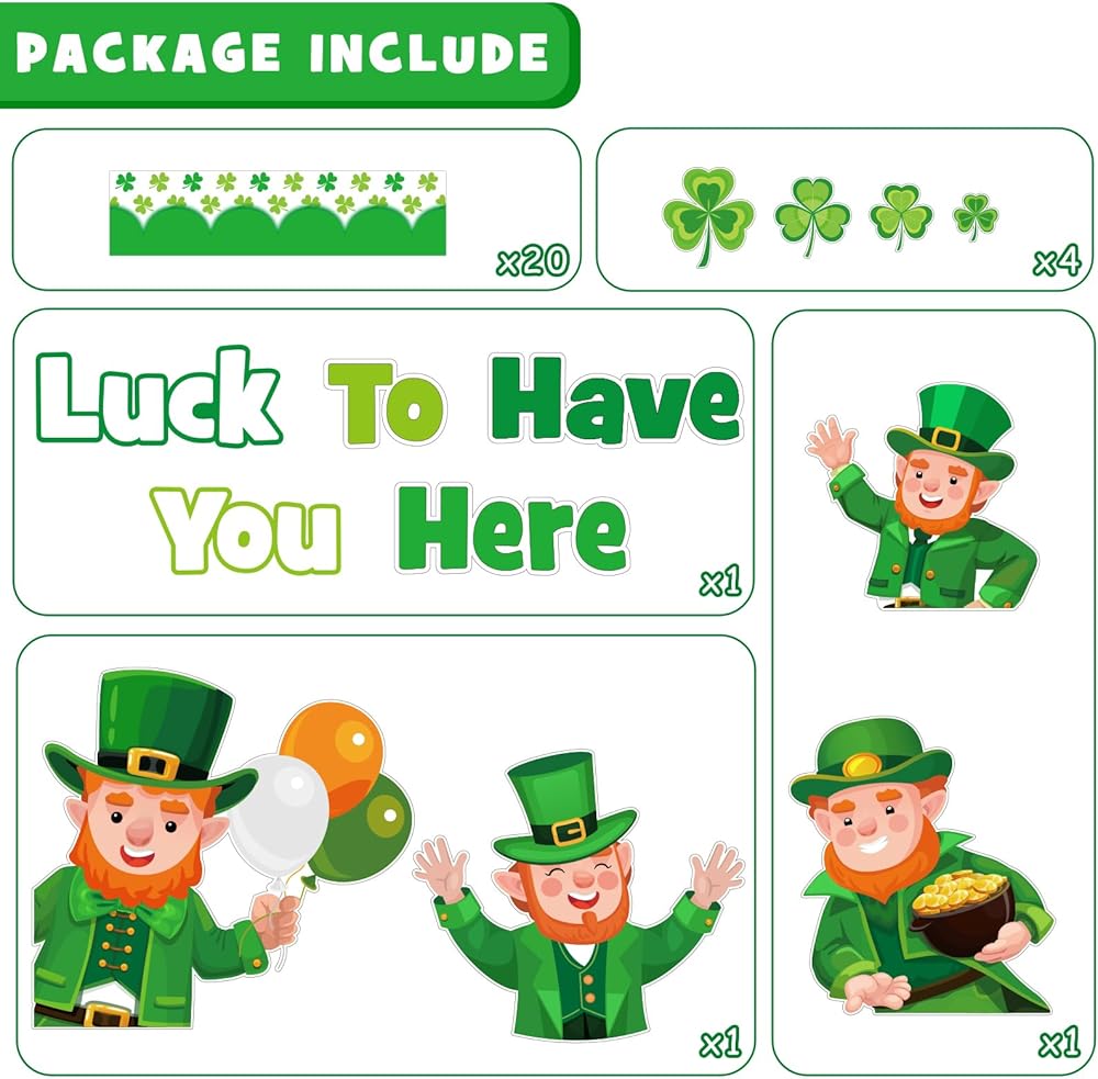 Package Includes: This St. Patrick's Day bulletin board decorations includes a ''Luck To Have You Here” letter cutout, 4 big leprechaun cutouts, 16 shamrocks cutouts, 20 bulletin board borders, and 80 glue points. The ample quantities enable you to exercise your creativity and transform your space into a lively St. Patrick's display