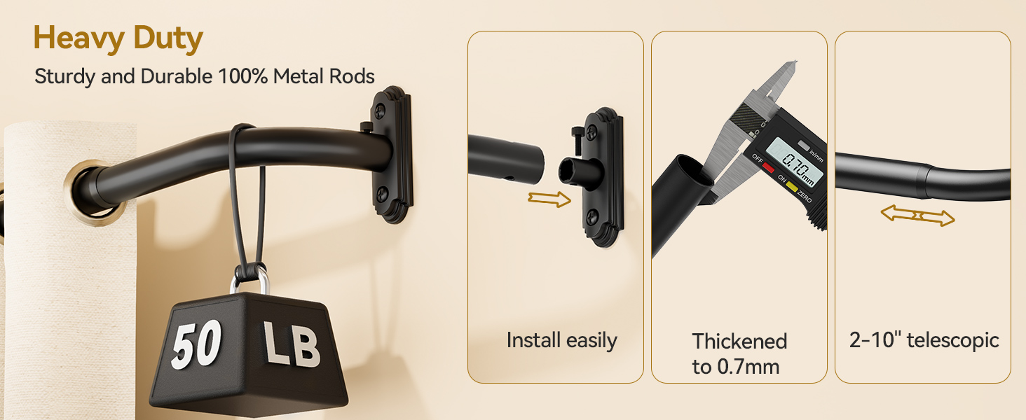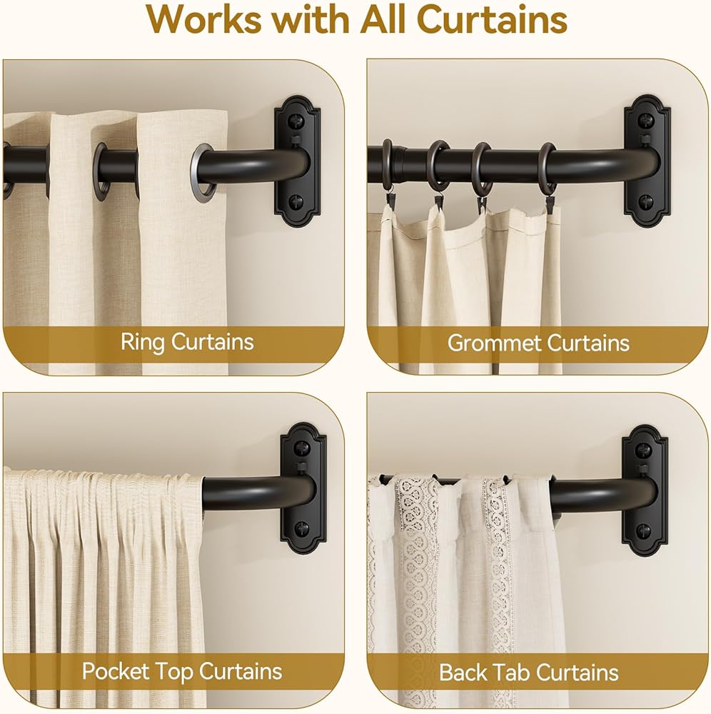 100% Metal & 50LB Heavy Duty:This YaFex heavy duty black curtain rod is crafted from 100% solid metal with a diameter of 1 inch and a thickness of 0.7mm, providing ample support for heavy, medium, and light curtains. So you won't have to worry about the curtain rod sagging or breaking over time.