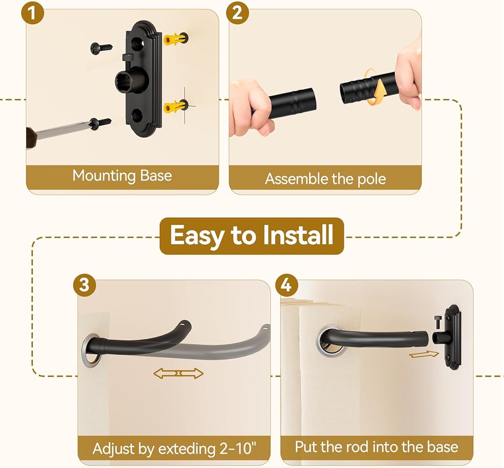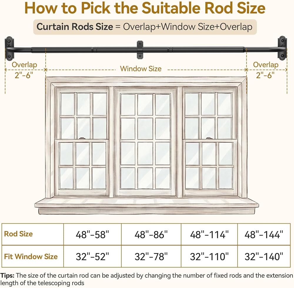 Adjustable Length & Easy Install: This YaFex long adjustable curtain rod features a telescoping rod from 2 to 10 inches, making it suitable for windows ranging from 48 to 82 inches. Each set of these blackout curtain rods comes with clear installation instructions, ensuring a straightforward setup process.
