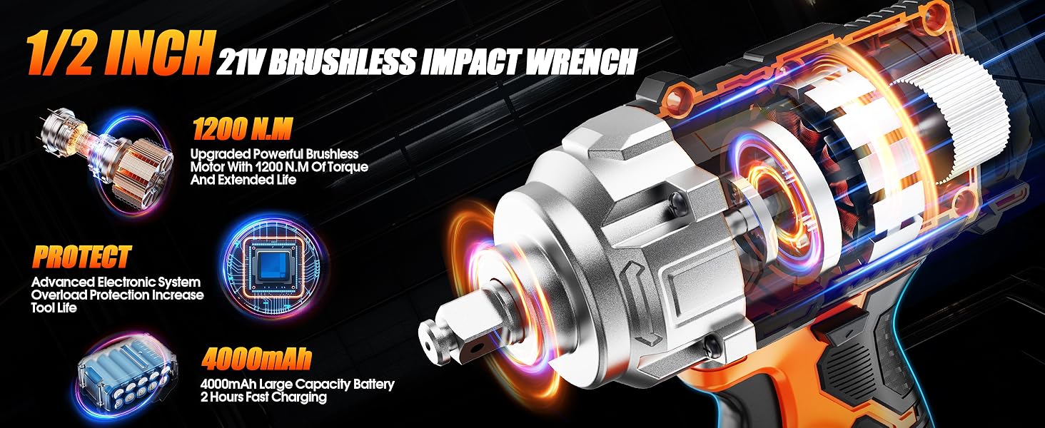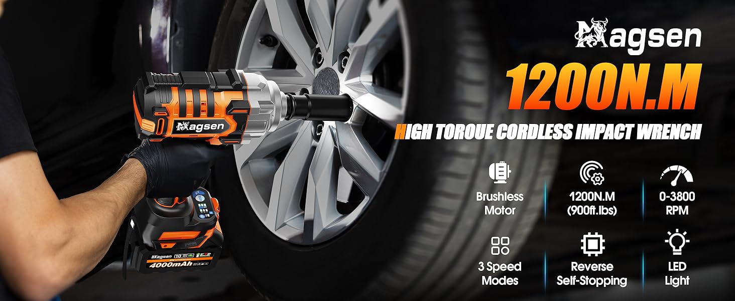 【1200N.m 21V High Torque Brushless Motor】The Magsen 1/2" Square Drive Impact Wrench features a high-efficiency brushless motor,delivers a maximum torque of 900ft-lbs (1200N.m),Our Impact Gun is engineered to tackle even the toughest bolts in seconds, whether you're dismantling car tires, tackling home projects or industrial tasks.
