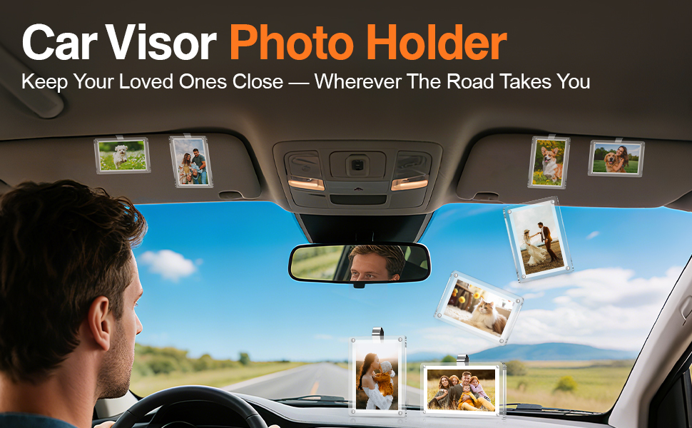 Quick Installation – Simply peel off the protective film, slide your photo into the car photo holder, and clip it onto your visor, clean effortlessly, keeping your pictures looking fresh.