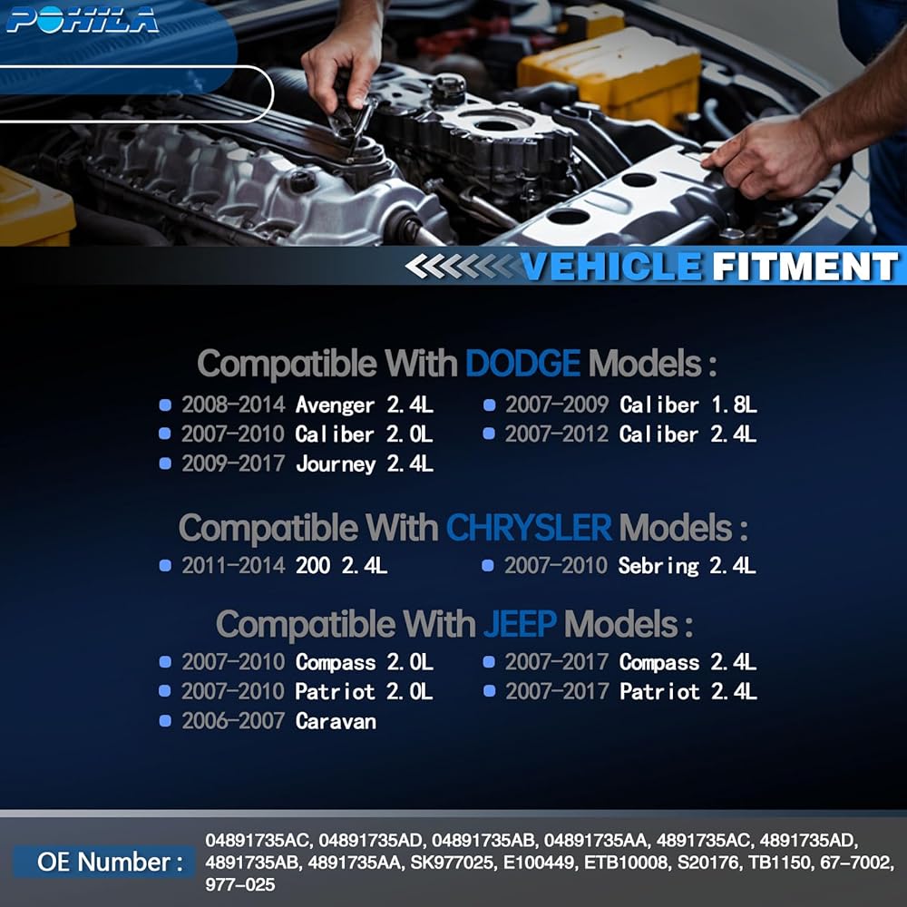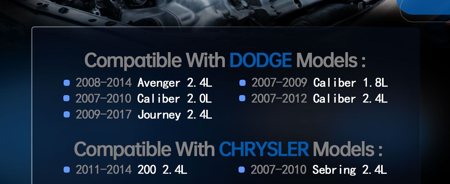 • 【Fitment】Compatible with Chrysler 200 2011-2014 2.4L, Sebring 2007-2010 2.4L; Compatible with Dodge Avenger 2008-2014 2.4L, Caliber 2007-2009 1.8L, Caliber 2007-2010 2.0L, Caliber 2007-2012 2.4L, Journey 2009-2017 2.4L; Compatible with Jeep Compass 2007-2010 2.0L, Compass 2007-2017 2.4L, Jeep Patriot 2007-2010 2.0L, Patriot 2007-2017 2.4L