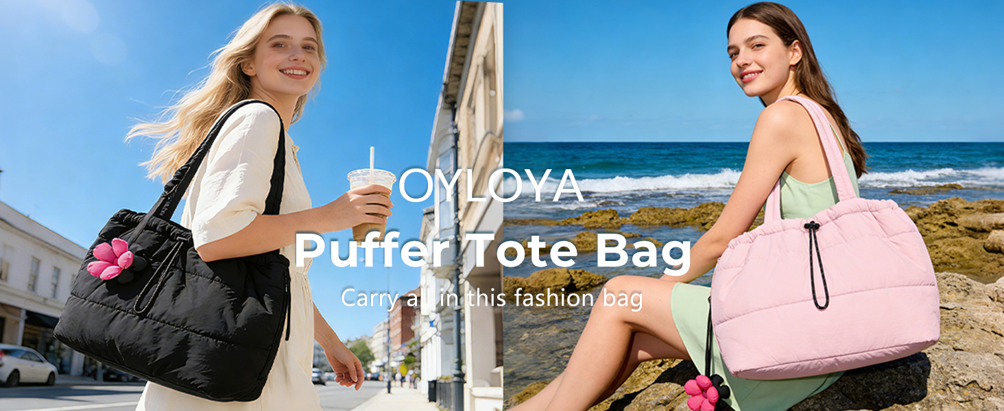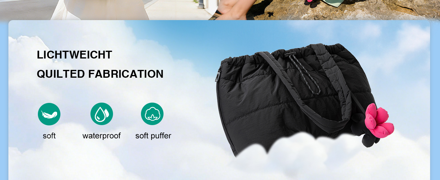 【Premium materials】OYLOLA puffer tote bag crafted from premium GRS-certified stretch nylon waterproof fabric, it wipes clean effortlessly lightweight and resists tearing. The lining combines breathable cotton with durable polyester fibers to create a soft, comfortable fit against the skin.