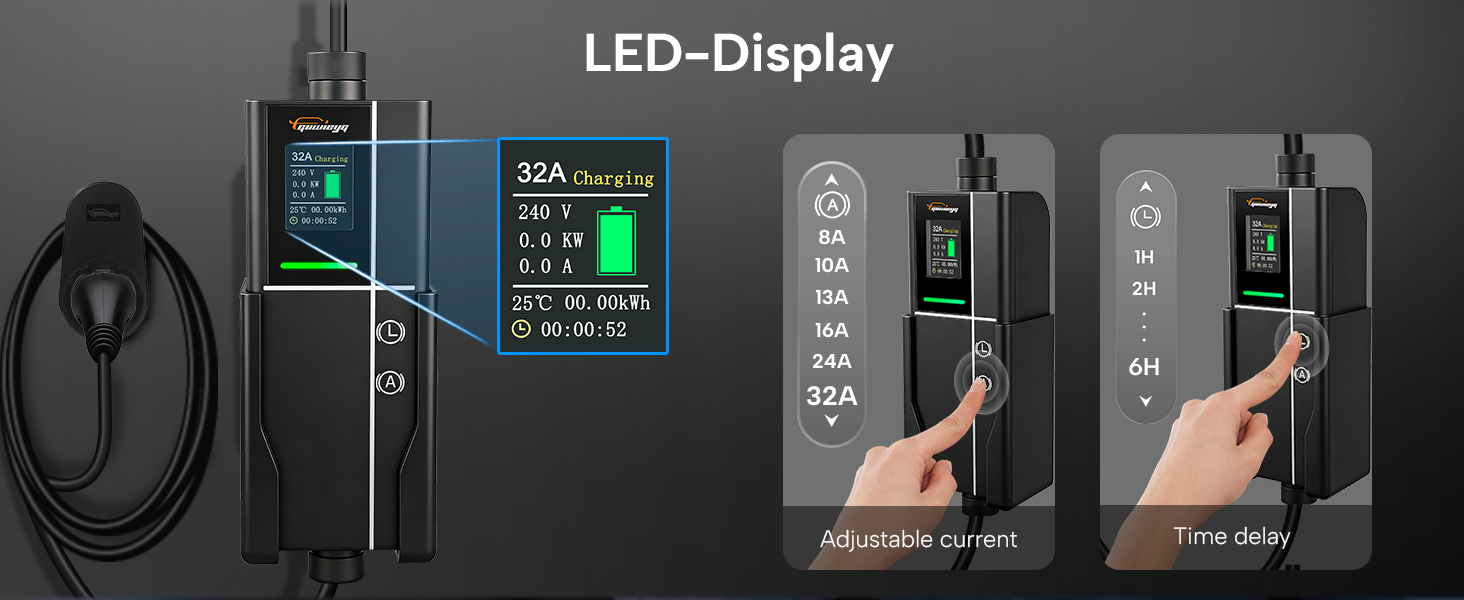 For Efficient Charging: Type2 portable charger maximum charging current can be switched between 8, 10, 13, 16, 24and 32A. Additionally, the timer function allows delaying the start of charging to a selected time period (1, 2, 3, 4, 5 or 6 hours)