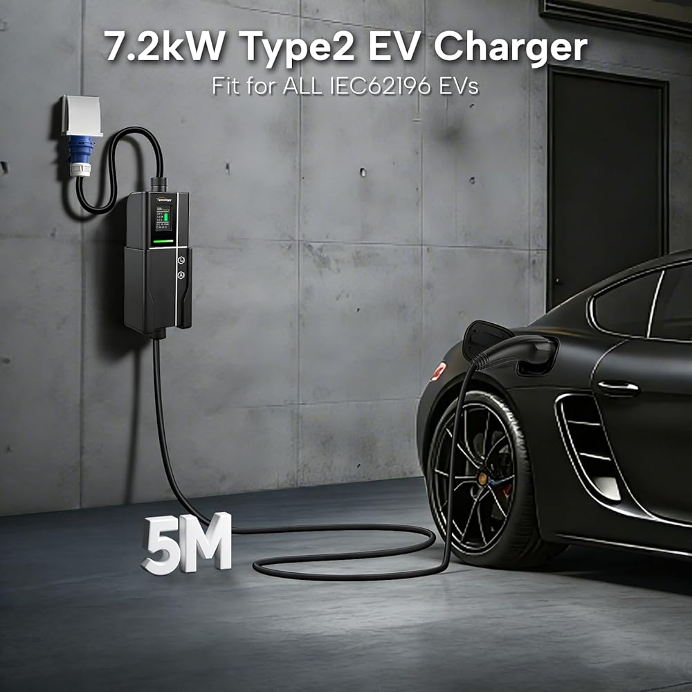 Safe and Fast Charging: Our portable ev charger delivers a maximum output of 7.2 kW, enabling faster charging speeds and shorter charging times. This charger connects to any public Type 2 charging station or home charging station, with a charging distance of up to 5 meter