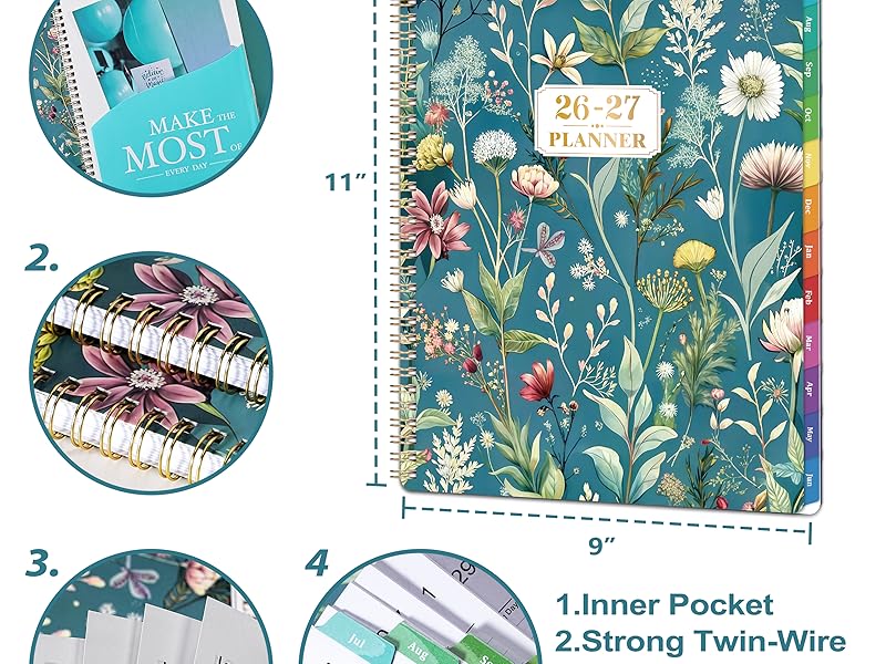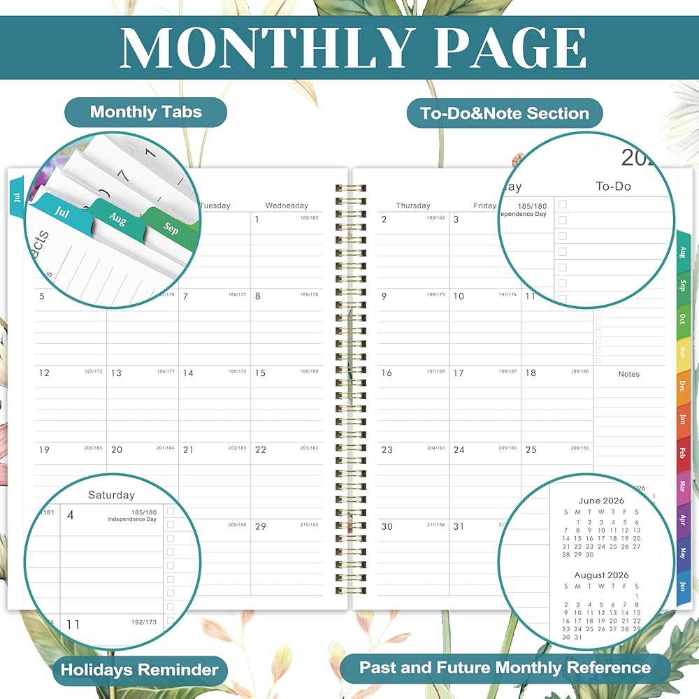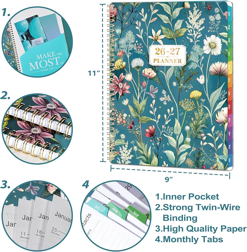 【FUNCTIONAL DETAILS】9" x 11" Monthly and Weekly Pages | Thicker Paper | 12 Monthly Tabs | Contacts | Quick Reference Information | 2026-2027 Yearly Overview | Reference Calendar | Strong Twin-Wire Binding | Hardcover | Large Daily Block | Back Pocket. Highlighted holidays and Julian date will help you better organize.