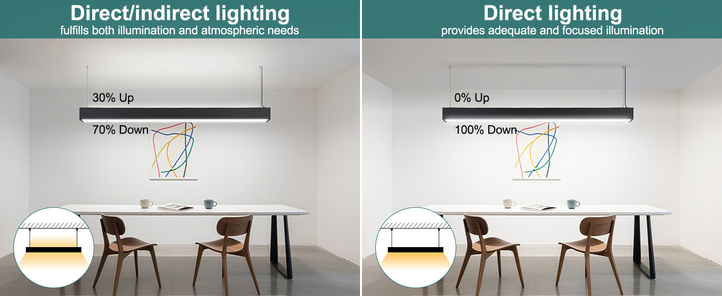 [3 Color Temperatures] This hanging office light with up and down lighting can be adjusted between 5000K Daylight, 4000K Natural White and 3000K Warm White. Just choose the type of light you need to create attentive, efficient or inviting atmosphere for different applications.
