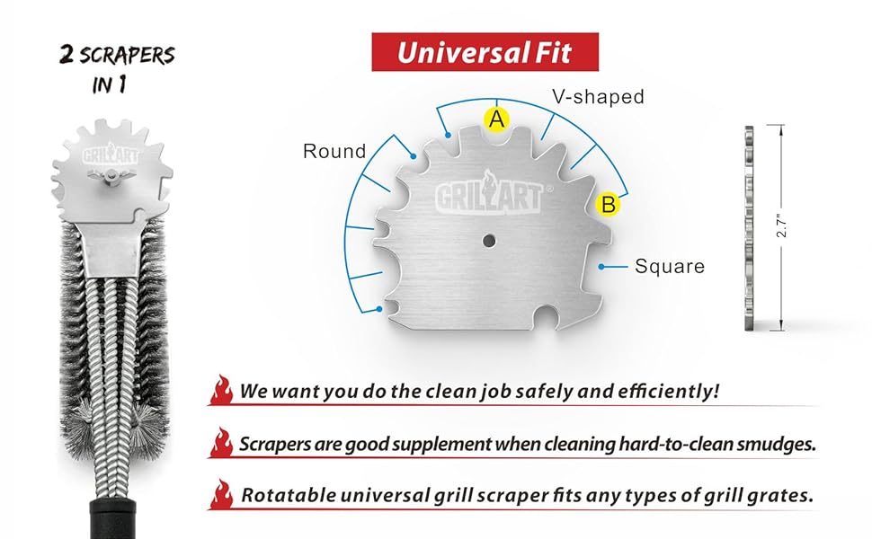 Double Scraper - Scrapers are good supplement when cleaning hard-to-clean smudges. Wider scraper at one end of brush removes greasy residual. Rotatable universal grill scraper fits any types of grill grates. ONLY need one screw/wing nut to install the extra scraper. The other is a back-up