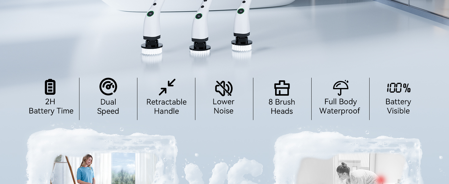 Dual Speed Modes: Built with a strong motor, the electric cleaning brush enables rotation at a high speed of up to 320 RPM. It supports switching between 2 different speeds of cleaning for both daily cleaning and deep cleaning