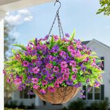 Superb Quality Material: The beautiful outdoor hanging basket comprises of a coconut coir basket with metal chains and 12 branches of artificial flowers with green eucalyptus leaves. The hanging fake plants are made of premium silk, each branch features a graceful blossoms and lush green leaves
