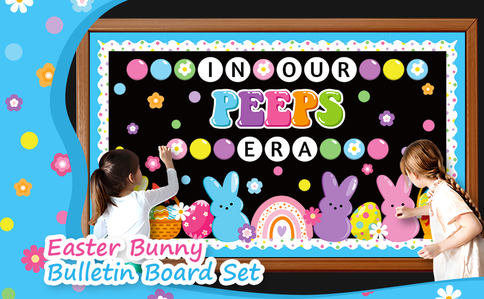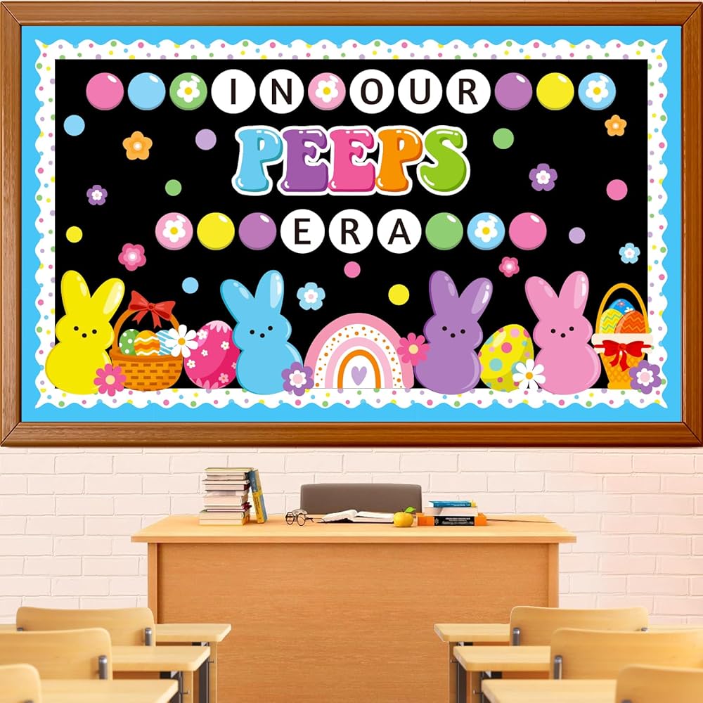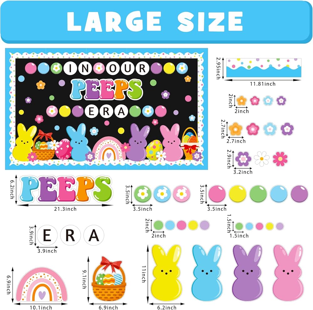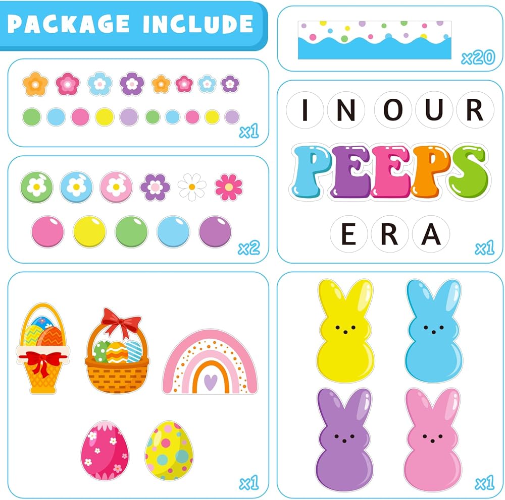 Package Includes: This Easter bunny bulletin board decorations includes ‘IN OUR PEEPS ERA' letters cutout, 20 flowers, 20 bubbles, 1 large rainbow, 2 basket eggs, 2 cute egg, 4 cute bunnies, 20 scalloped borders, 80 glue points for easy setup. These high-impact Easter decorations create a welcoming space that celebrates each student's unique growth and joy this Easter season.
