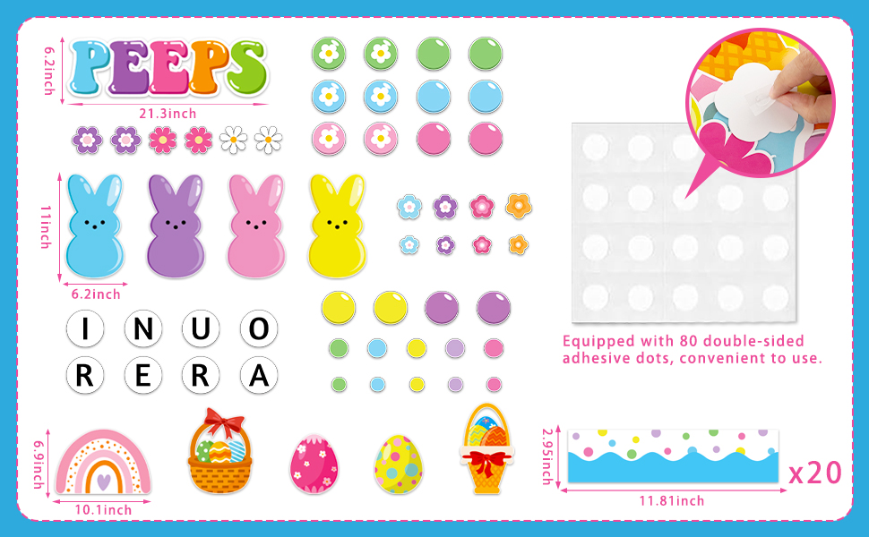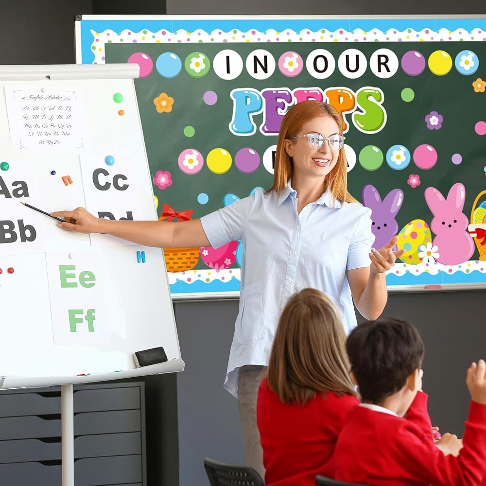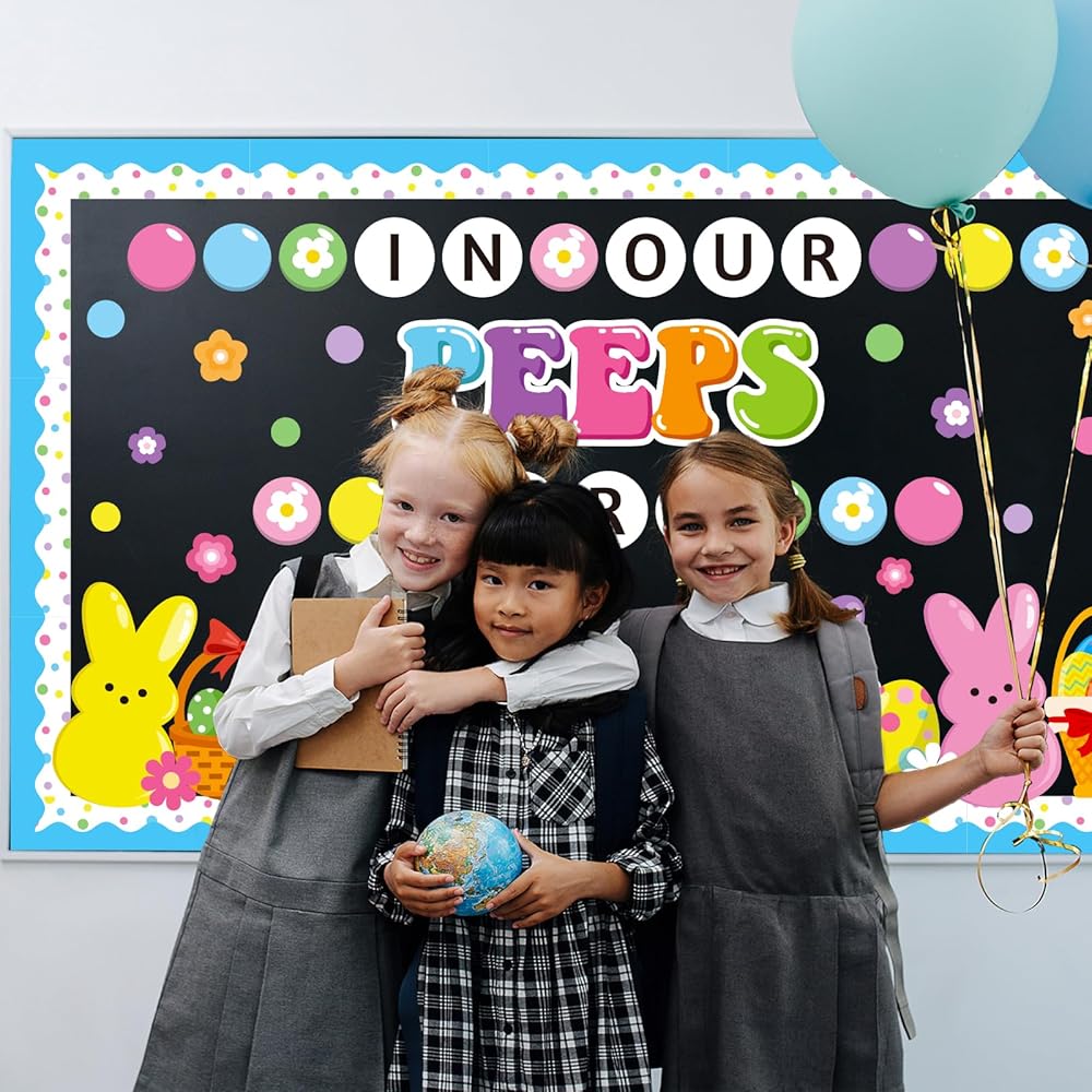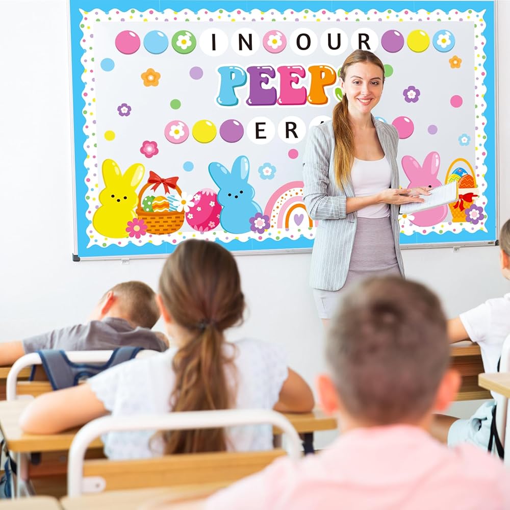 Package Includes: This Easter bunny bulletin board decorations includes ‘IN OUR PEEPS ERA' letters cutout, 20 flowers, 20 bubbles, 1 large rainbow, 2 basket eggs, 2 cute egg, 4 cute bunnies, 20 scalloped borders, 80 glue points for easy setup. These high-impact Easter decorations create a welcoming space that celebrates each student's unique growth and joy this Easter season.