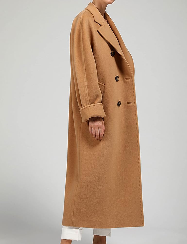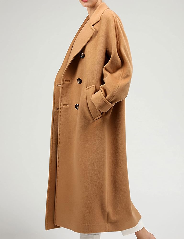 Features - Classic pea coat for women, wasit belt and patch pockets, roll up cuffs detail, classic notched lapel long sleeve solid color chunky jacket outerwear, double breasted placket mid-Length long wool blend coat, multi color for classic camel coat women, beige and black winter coats