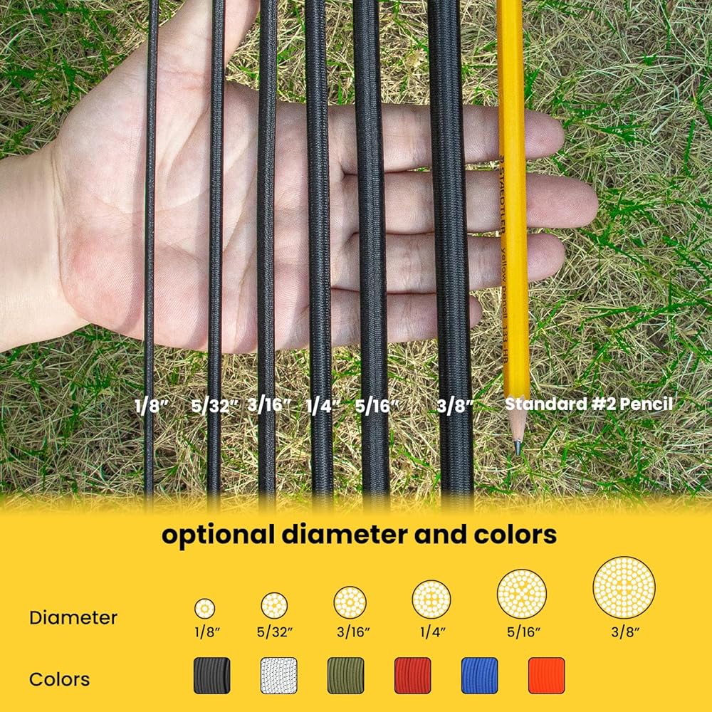 ✅【Excellent 100% Stretch】Each elastic rope is composed of polyester outer sheath and superior rubber cores. No matter which size you choose, the elastic shock cords have capability of approximate 100% elongation, which means they can stretch to double their original length and offer fantastic shock resistance. But we do not recommend using at maximum stretch for safety.
