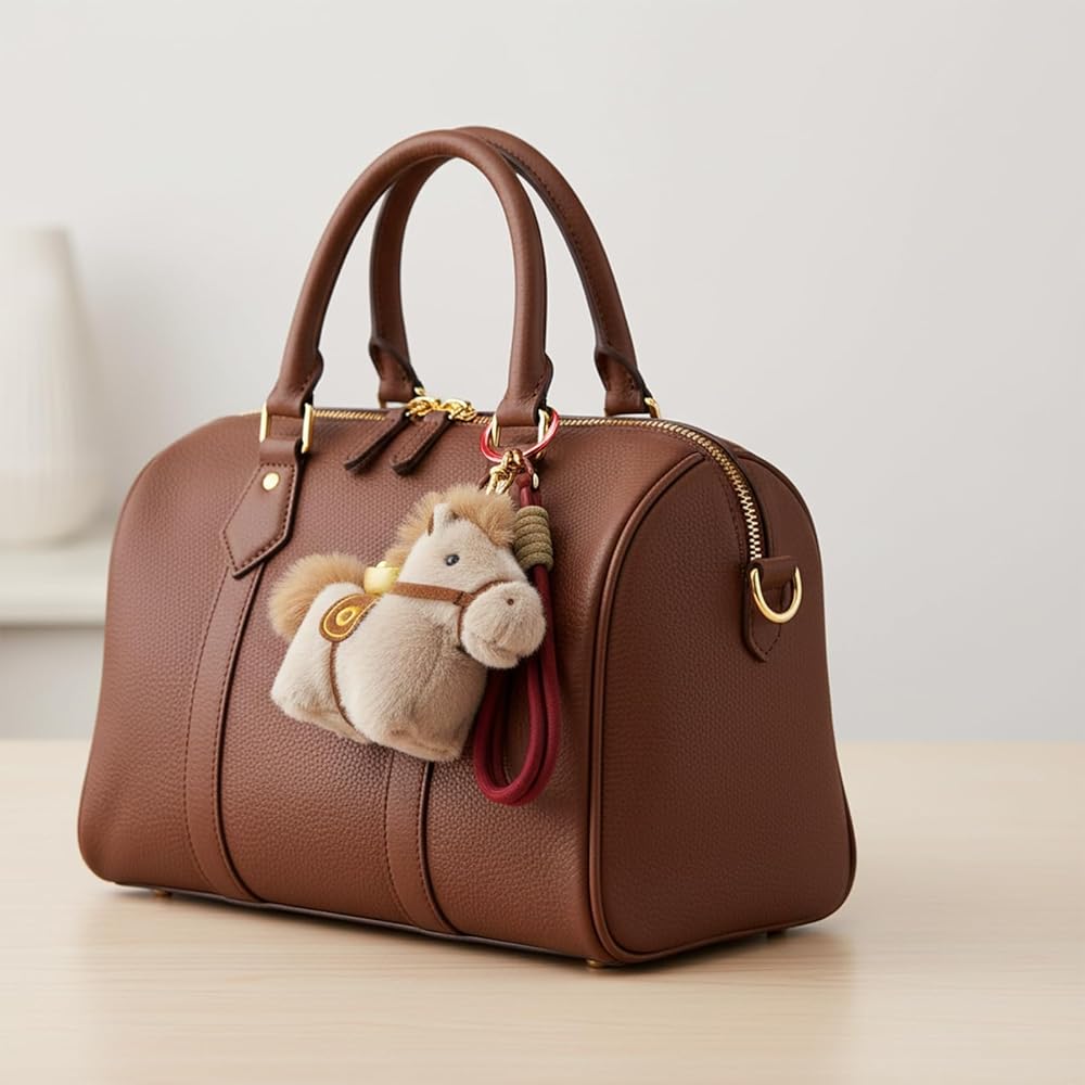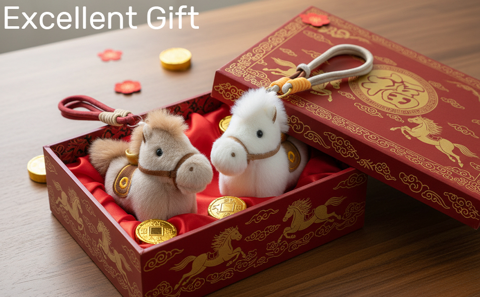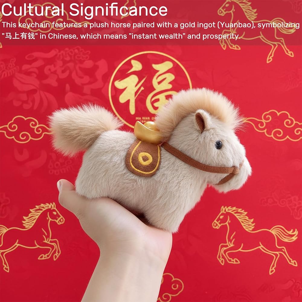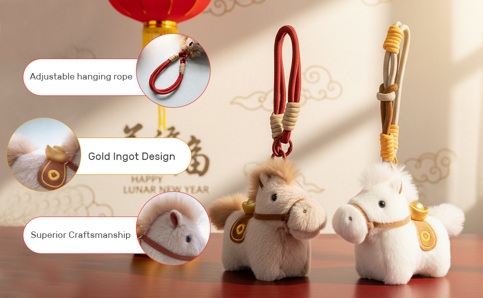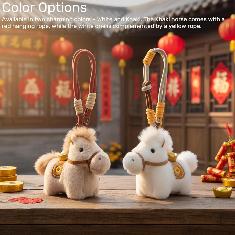Introducing the Plush Horse with Gold Ingot Keychain, a charming and culturally significant accessory that combines traditional Chinese symbolism with modern design. This adorable keychain is well-suited for women who appreciate delicate trinkets and are looking for a special way to add a touch of elegance to their everyday items. Key Features: Cultural Symbolism: The keychain features a plush horse paired with a gold ingot (Yuanbao), symbolizing "instant wealth" and prosperity. This combination is believed to bring good fortune and financial success. Color Variety: Choose from two delightful color options – White and Khaki. The Khaki horse is paired with a vibrant red hanging rope, while the white horse comes with a cheerful yellow rope. Both designs feature a gold ingot on the saddle, adding a touch of luxury and tradition. Versatility: The included hanging rope allows you to attach this keychain to your keys, backpack, or even use it as a decorative accessory for your car. Its versatility makes it a practical and stylish addition to your daily life. Thoughtful Gift: Whether it's for a birthday, party, Christmas, or a gift exchange, this keychain is a thoughtful and meaningful present. This keychain is also believed to enhance the feng shui of your surroundings, bringing positive energy and good fortune. It is particularly fitting for the upcoming Year of the Horse in 2026, making it a timely and auspicious gift. Quality and Longevity: Crafted with superior materials, this keychain is designed to last. The plush horse is soft and well-made, while the gold ingot and hanging rope are securely attached, ensuring that it remains a cherished accessory for years to come. Choose the Plush Horse with Gold Ingot Keychain to bring a touch of cultural significance and charm to your accessories. Whether for yourself or as a gift, this keychain is a wonderful way to share the blessings of prosperity and good fortune.