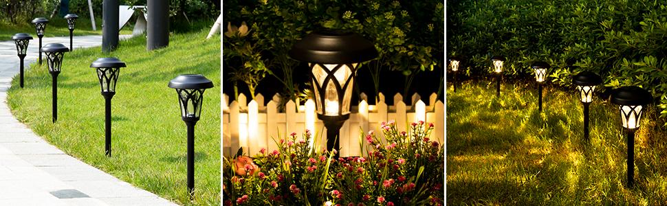 【Upgraded Brightness & Longer Lighting】Equipped with larger solar panels and durable AA 600mAh rechargeable battery, these solar garden lights provide up to 8-10 hours of warm white illumination after 6-8 hours of full charge.
