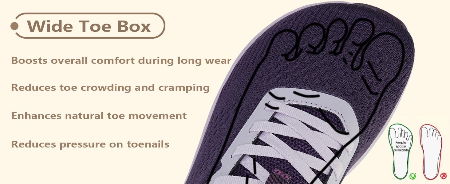 - Wide toe box offers more room for movement, allowing toes to splay naturally