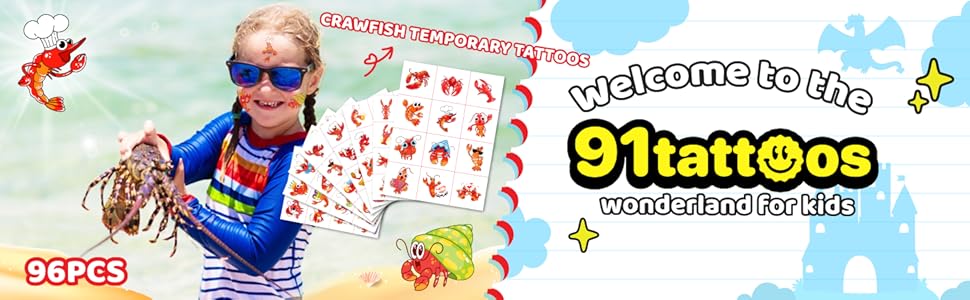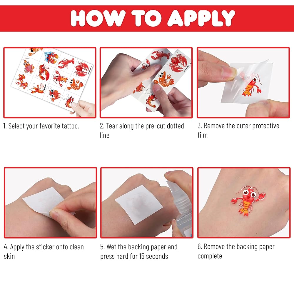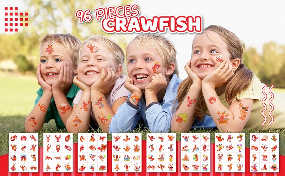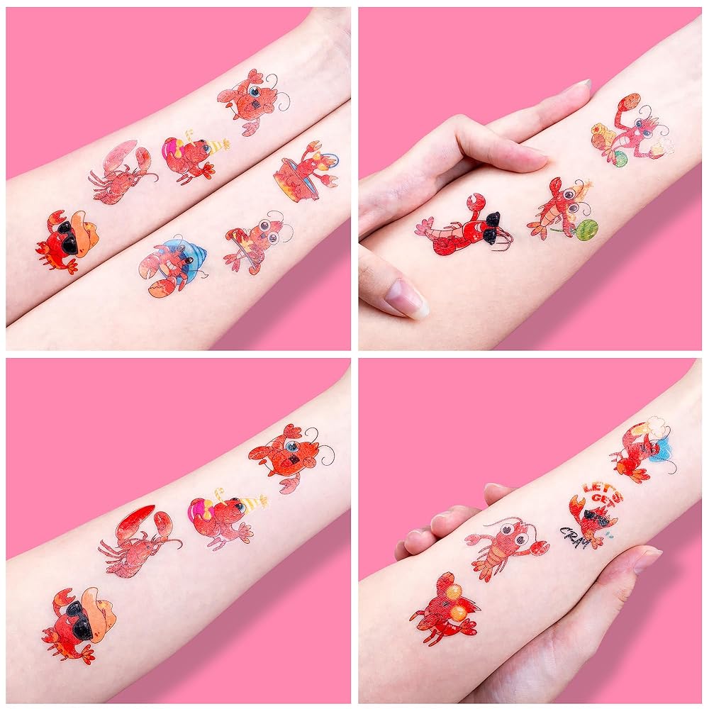 Perfect for Crawfish Boil Ocean Animal Birthday Party Decorations Supplies & Events: Great for themed party, birthday activities, school reward and other party events. This tattoos stickers can be applied on arms, hands, face, neck, shoulders,... to make you look cool at all kinds of party. Popular hit with your kids. You can apply them to your body or some smooth objects, for example, glass, laptop, paper, cups, bottle,..