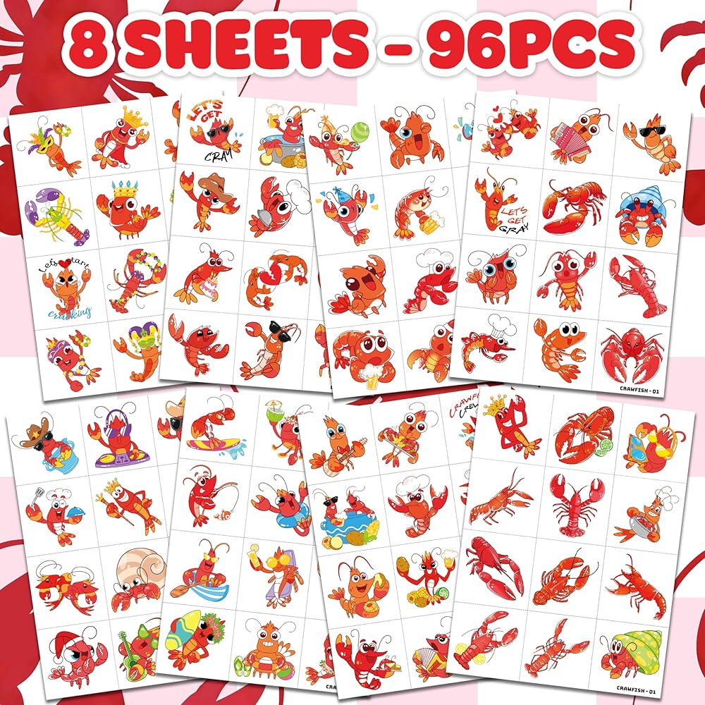 Package Includes: 8 Sheets Crawfish Boil Ocean Animal Pre-Cut temporary tattoo, total 96 PCS different designs tattoos stickers. The sheets measures 6.3 inch X 4.7 inch, one size fit all adult and kids. Can meet most of your needs.