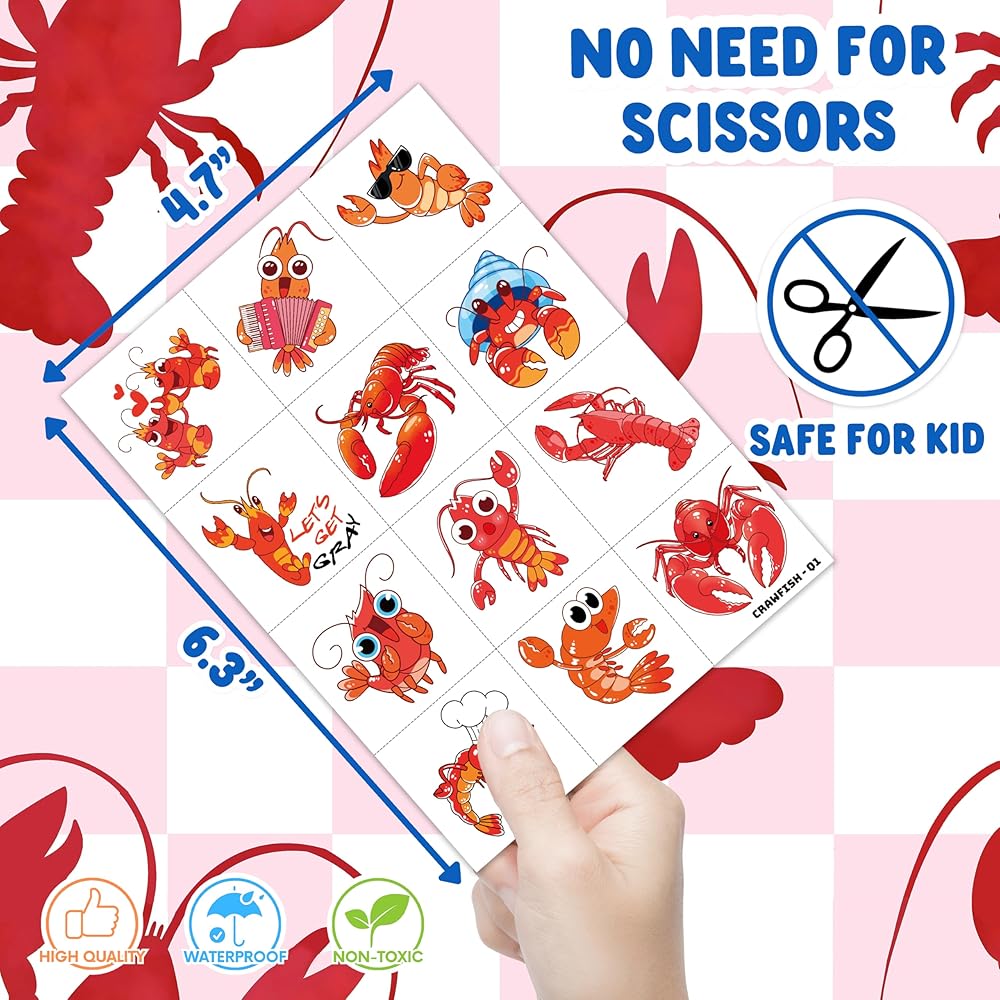 Creative and Fun: This Crawfish Boil Ocean Animal Pre-Cut temporary tattoos set includes a variety of playful and cute designs, encouraging your child's imagination and creativity. Bring nonstop joy to the whole birthday or party. Make your kids receive full of expectation and exploration in every festival.