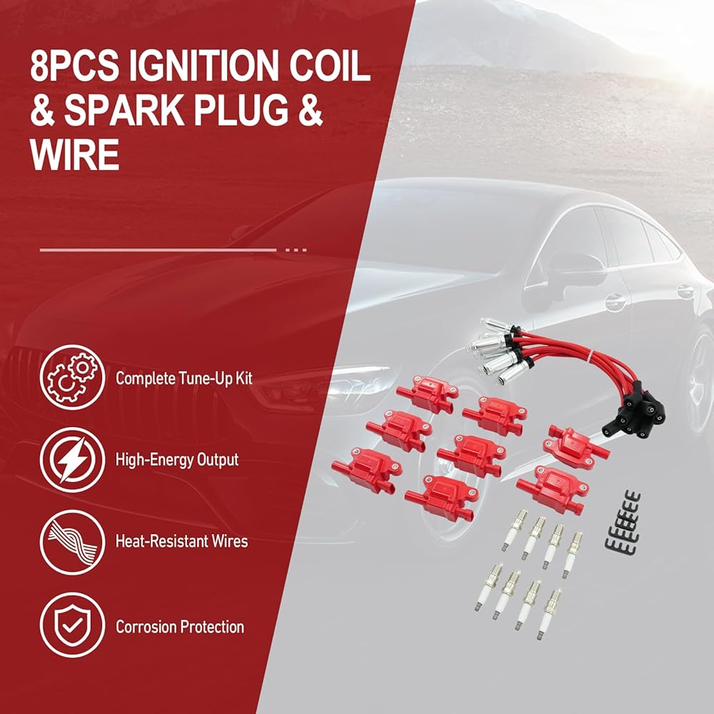 Ignition Coil & Spark Plug & Wire 8PCS compatible with Chevy Silverado 1500/Tahoe, GMC Yukon, Pontiac G8/Grand Prix, Hummer H3, Replaces OE UF413, D510C, 5C1554