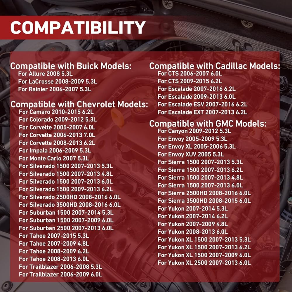 Fitment 3: Fits GMC Canyon 2009-2012 5.3L, Envoy 2005-2009 5.3L, Envoy XL 2005-2006 5.3L, Envoy XUV 2005 5.3L, Sierra 1500 2007-2013 5.3L, 6.2L, 4.8L, 6.0L, Sierra 2500HD/3500HD 2008-2016 6.0L, Yukon 2007-2014 5.3L 6.2L, 2007-2009 4.8L, 2008-2013 6.0L, Yukon XL 1500 2007-2013 5.3L 6.2L, 2007-2009 6.0L, Yukon XL 2500 2007-2013 6.0L