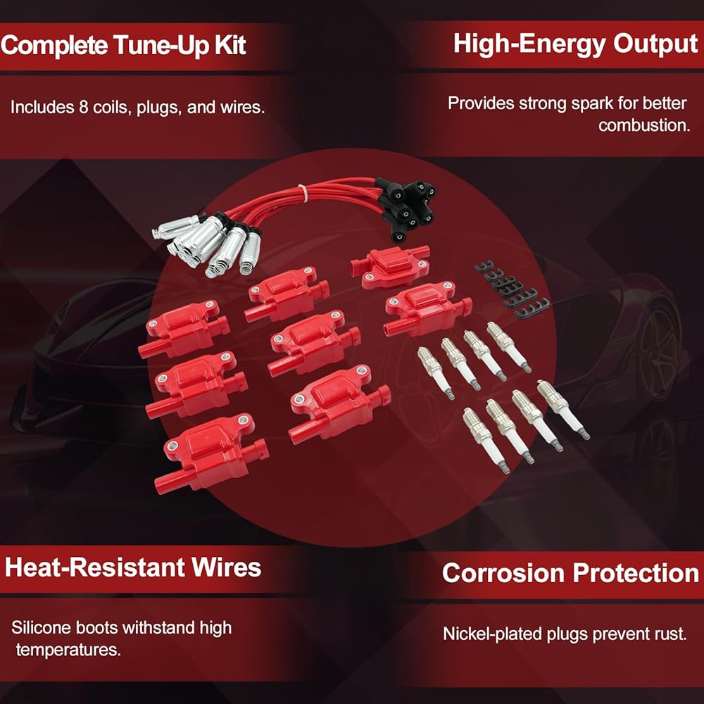 Fitment 1: Ignition coil, spark plug, and wire set fits Buick Allure 2008, LaCrosse 2008-2009, Rainier 2006-2007 5.3L; Cadillac CTS 2006-2007 6.0L, CTS 2009-2015 6.2L, Escalade 2007-2016 6.2L, 2009-2013 6.0L, Escalade ESV 2007-2016 6.2L, Escalade EXT 2007-2013 6.2L; Hummer H2 2008-2009 6.2L, H3/H3T 2008-2010 5.3L; Pontiac G8 2008-2009 6.0L, 2009 6.2L, GTO 2005-2006 6.0L, Grand Prix 2006-2008 5.3L; Saab 9-7x 2005-2009 5.3L, 2008-2009 6.0L