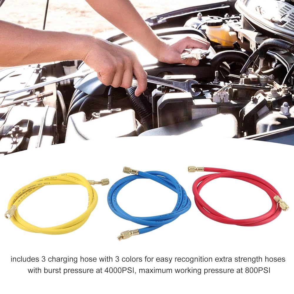COMPLETE DIAGNOSTIC SOLUTION: This comprehensive set includes three colorcoded- charging hoses 4000PSI( burst strength) and seven essential accessories. distinct hose colors help crosscontamination- between different refrigerant types during system servicing and maintenance.