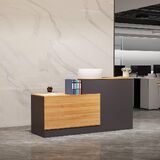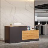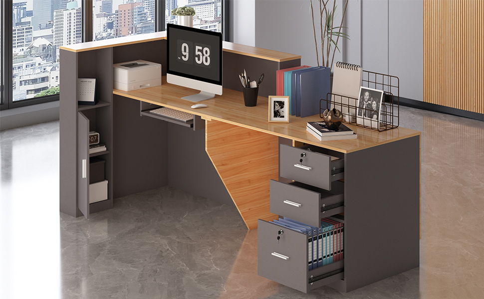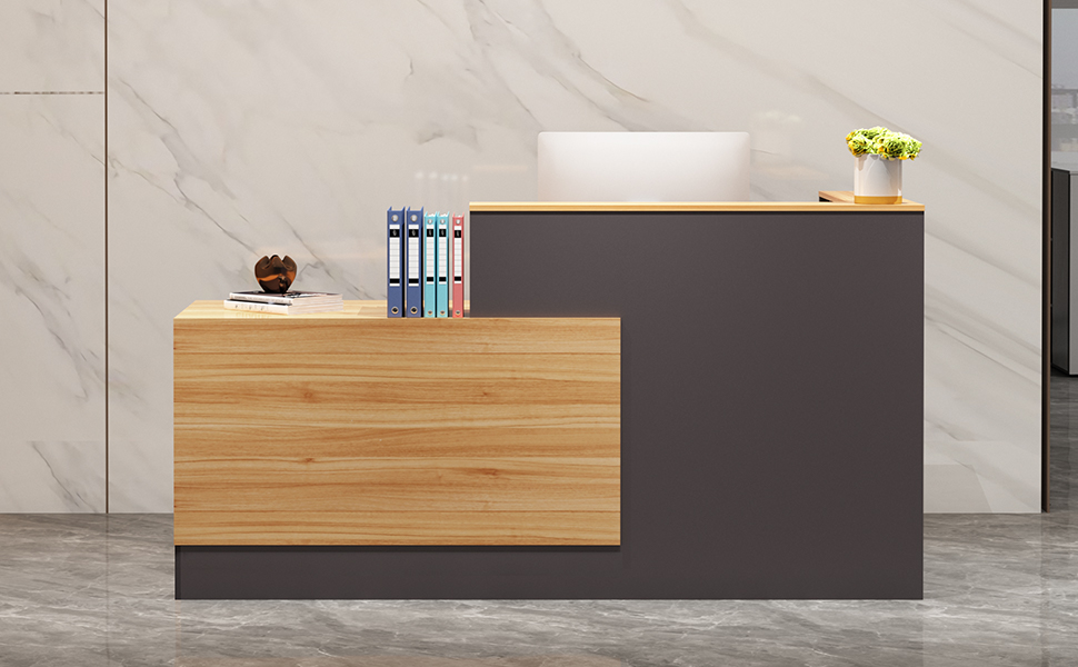 【Modern L-Shaped Design】 A stylish blend of Natural Wood & Slate Grey that creates a professional first impression. The elevated transaction top is perfect for guest sign-ins, while the semi-enclosed front panel ensures a private yet approachable workspace.