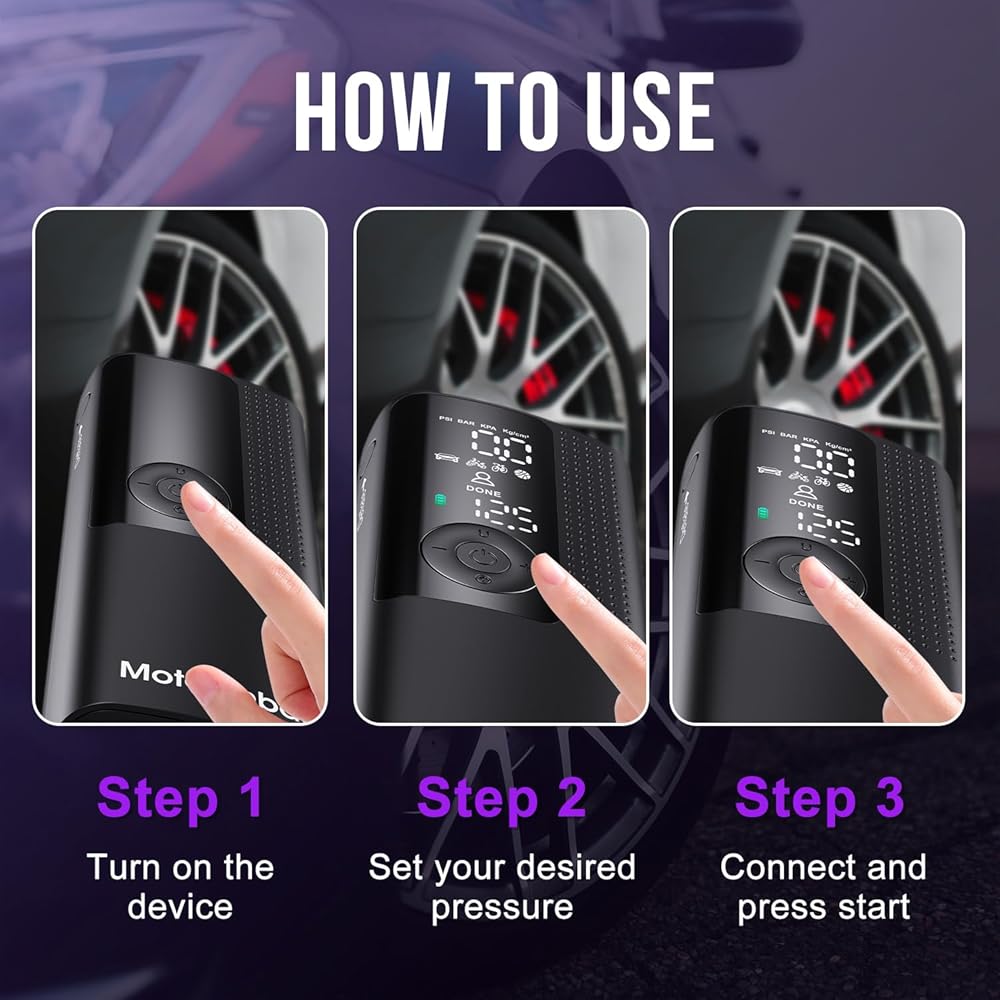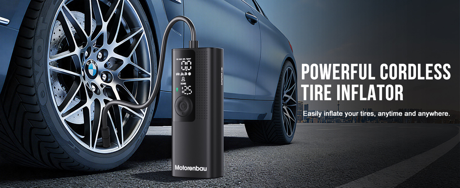 Auto Shut-Off & Accurate LCD Display: Motorenbau car tire air pump builts in pressure gauge and LCD screen, which you can accurately monitor real-time tire pressure. You can easily select your desired pressure using the "+" and "-" controls. Simply connect the air hose to your car and press the "Start" button in the middle of the pump. Once the correct pressure is reached, it automatically shuts off, ensuring optimal tire performance and safety. This cordless car tire pump makes inflating all your tires hassle-free.