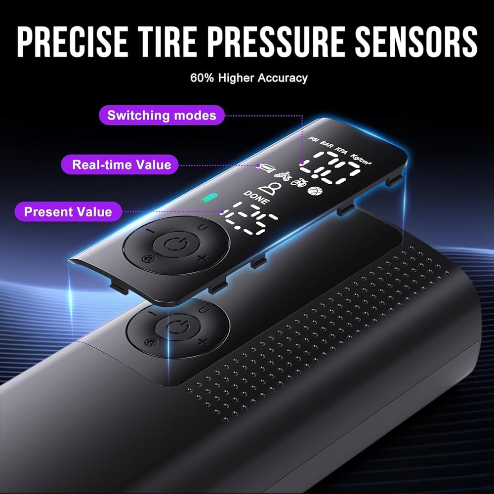 Multiple Inflation Modes: With the touch of a button, you can easily switch between pressure units of PSI, kPa, BAR, and KG/CM. Four preset inflation modes are available for bicycles, motorcycles, cars, and balls. Additionally, the fifth custom mode allows you to customize the pressure based on the object being inflated, allowing you to achieve a wider range of inflation options.