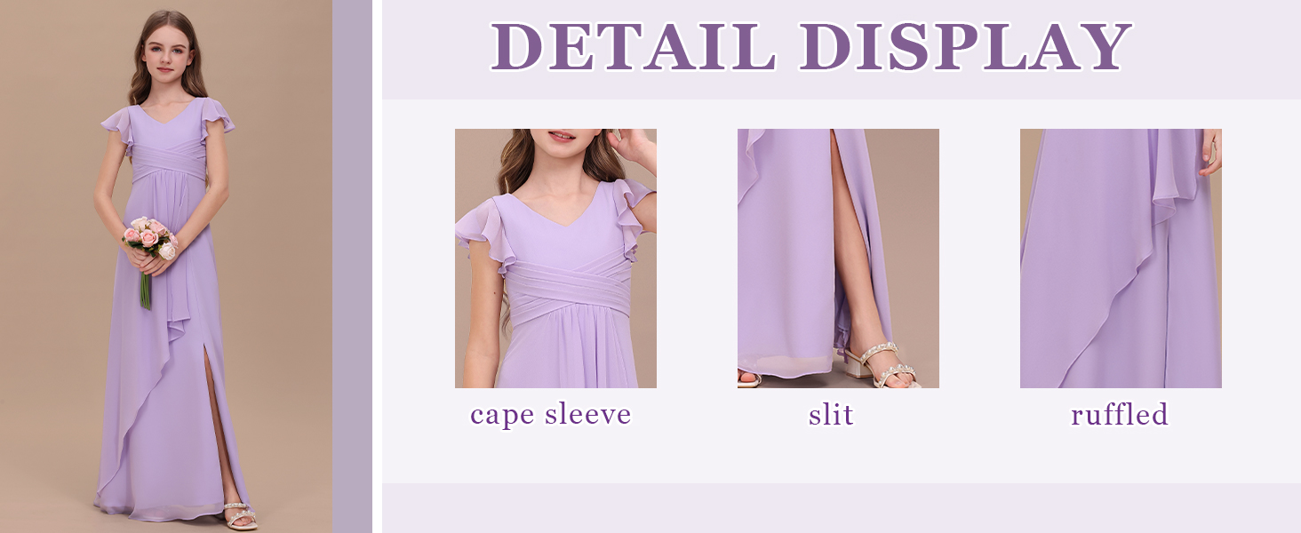 Features: This teens' chiffon bridesmaid dress features a V-neck, ruffled short sleeves, and a crisscross pleated bodice. Its asymmetric layered skirt with a slit combines elegance and playfulness, perfect for formal occasions like wedding flower girls.