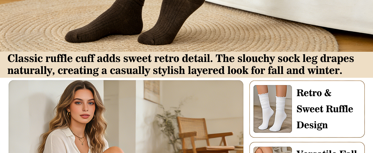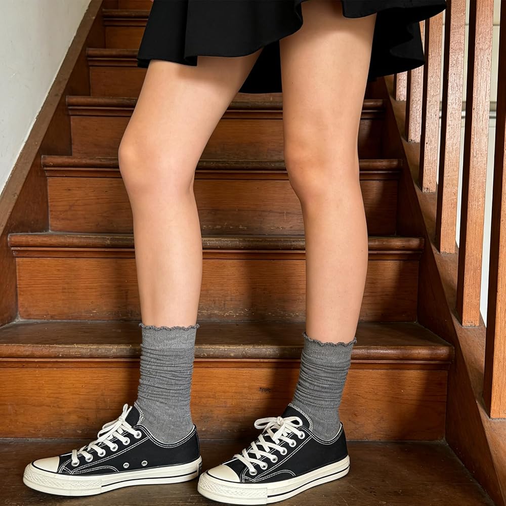 Cityelf Ruffle Slouchy Socks blend playful vintage charm with everyday comfort. Born from a small atelier where knitters passed down techniques across generations, Cityelf evokes a rich history and cultural heritage—handed down hems, scalloped socks for women inspired by classic European dress, and modern stitches that honor tradition. These womens ruffle socks deliver a wardrobe staple rooted in story. Designed for women who want cute socks with practical performance, this 6 pairs pack includes mixed color options with white frilly socks women among soft pastels. Material: 80% Cotton, 15% Polyester, 5% Spandex creates frilly soft casual breathable socks for women that stay cozy, breathable, and durable. The cushioned sole arch support on the heel and foot prevent slipping inside loafers or boots—perfect for frilly loafer socks womens or ruffle boot sock looks without blisters or bunching. Style notes: wear as ankle ruffle socks cute lettuce edge crew or slouchy crew socks; try ruffle turn-cuff casual crew socks or cute knit lettuce trim dress ankle socks to elevate sneakers, Mary Janes, for Doc Martens. These cute frilly ankle socks for women function as white ruffled socks for dress looks or ruffle socks white for playful everyday outfits. The lightweight knit feels like frilly breathable cotton crew socks, while the ruffle edge keeps shape wash after wash. Buyer benefits: pairs ruffle socks soft cute reduce shoe discomfort; adult ruffle socks offer timeless frilly sock flair; frilly soft cotton crew ankle socks for women make thoughtful gifts. Whether you need cute white socks women for a special outfit, comfy ankle socks cute for daily wear, or stylish white ruffle socks for photos, Cityelf provides high quality ruffle socks that fit, flatter, and celebrate a heritage of handcrafted comfort.
