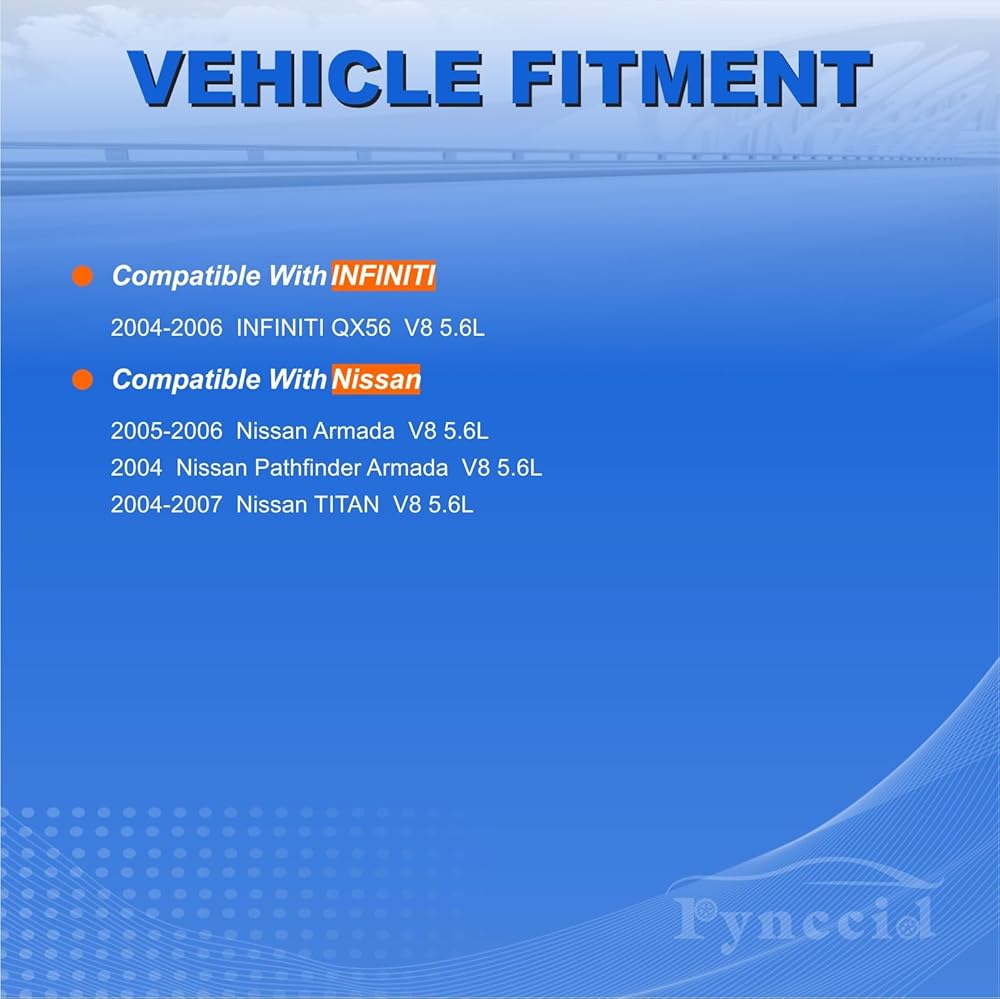 Pynccid 8-Pack UF510 Ignition Coil & 6240 Iridium Spark Plug Set delivers perfect compatibility for your vehicle! This complete tune-up kit is engineered to fit 2004-2006 INFINITI QX56 and Nissan Titan, Armada, Pathfinder Armada with 5.6L V8 engines. Directly replaces part numbers GN10243 and 5C1482, ensuring perfect OEM-style fitment. Experience restored engine performance with smoother acceleration, eliminated misfires, and reliable cold starts. The ideal solution for maintaining your SUV or truck's peak performance, whether for daily driving or heavy-duty use.