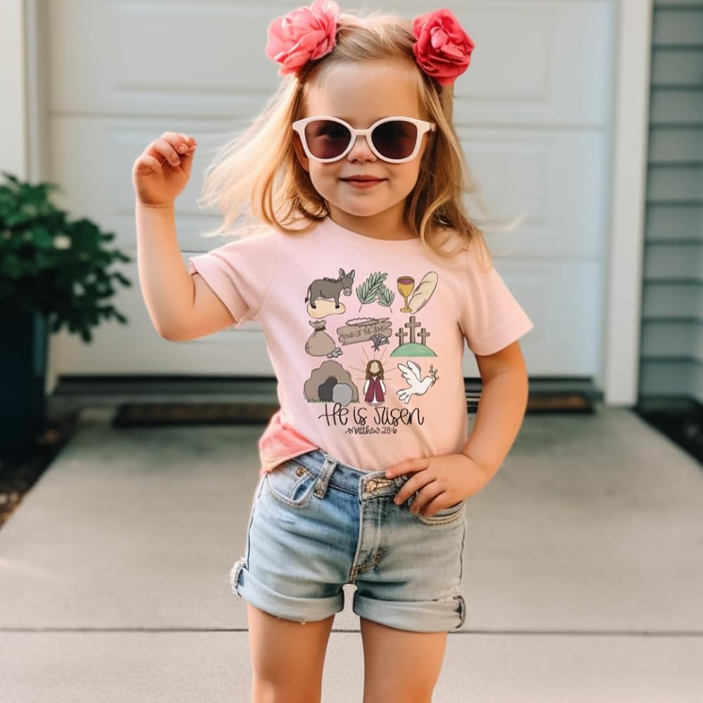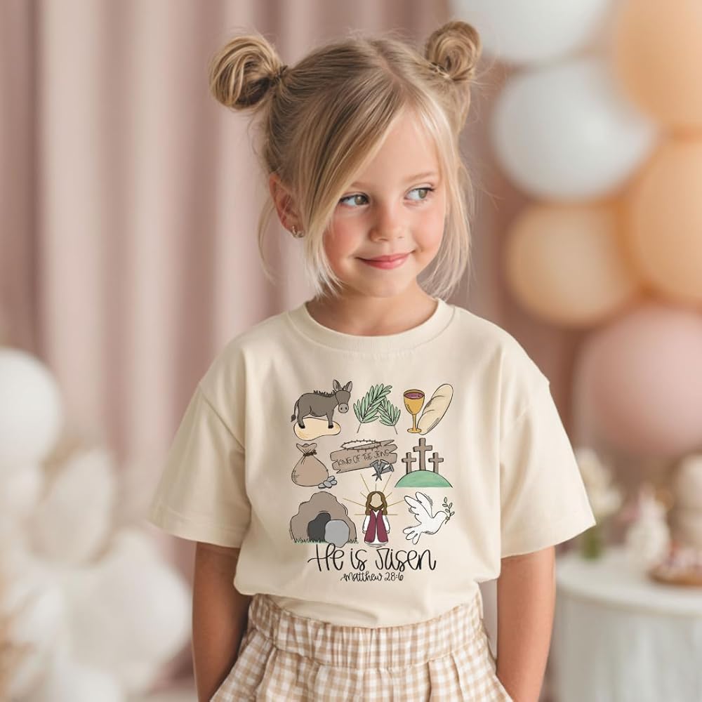 Teach the true meaning of Easter with this beautifully illustrated Christian kids shirt inspired by Matthew 28 6 ✝️ Featuring the message “He Is Risen” surrounded by meaningful biblical symbols this tee gently tells the story of Jesus' journey from Palm Sunday to the resurrection. Each element in the design helps children visually connect with the Easter story making it perfect for church services Sunday school Christian classrooms and family worship moments. The artwork is engaging without being overwhelming allowing kids to proudly wear their faith in a joyful age appropriate way. Crafted from soft comfortable fabric this kids Christian t shirt is designed for all day wear whether your child is attending Easter service celebrating with family or enjoying everyday play. Its unisex style makes it suitable for both boys and girls and easy to pass down or match with siblings. This faith based kids shirt is a meaningful reminder of hope love and victory through Christ and makes a beautiful Easter gift that families will cherish year after year.