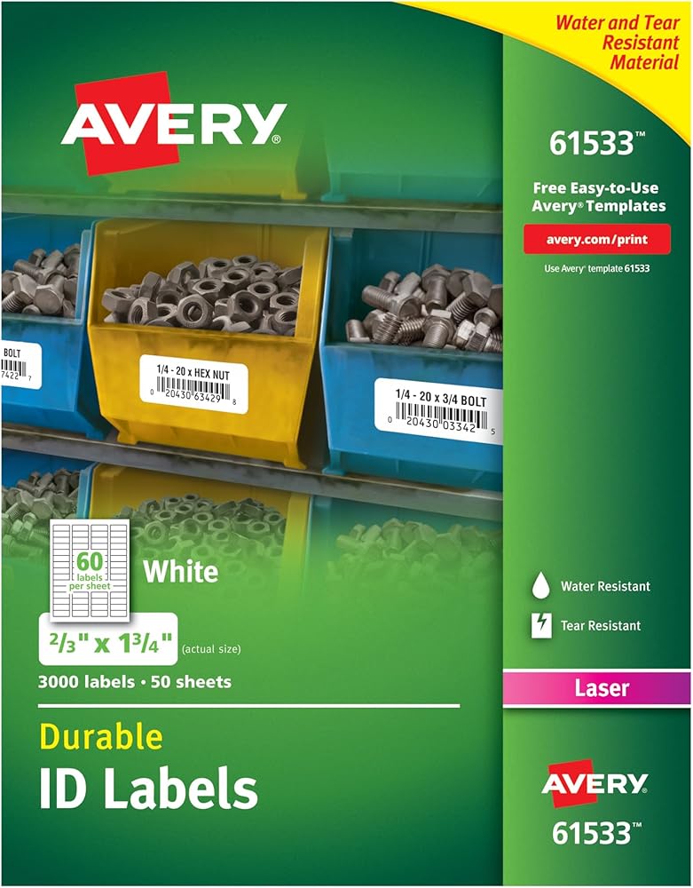 Identify property and display easy-to-read information with Avery durable ID labels featuring TrueBlock technology. Use for bin labels, barcode labels, asset tags and safety and warning labels. TrueBlock labels completely cover up what's underneath, so you can re-label items, shelves or containers without distracting marks showing through. Strong polyester label material is waterproof and resistant to scuffing, tearing and smudging. Extra-strong adhesive makes sure labels stay permanently attached. Stands tough in extreme temperatures and high-traffic areas. Make custom labels with free templates and designs, and online barcode generator helps you add a bar code, upc code or serialized numbers in just a few steps. Compatible with laser printers.