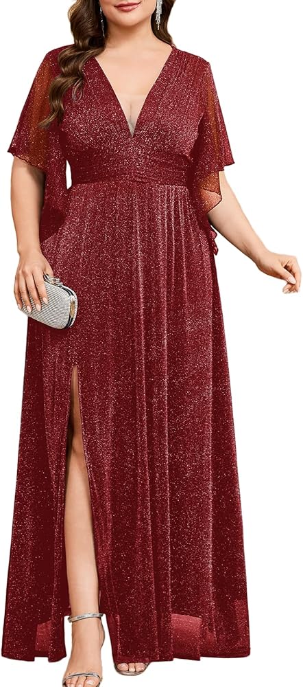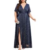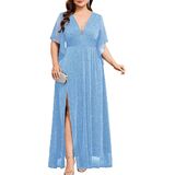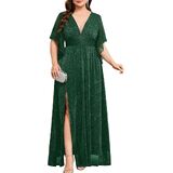 Radiant Shimmer & Allure: This plus size maxi dress is crafted from shimmering fabric that catches the light beautifully, while the plunging V-neck adds a touch of allure to elevate your look. Designed with flowing handkerchief sleeves, it creates a graceful and flattering silhouette with effortless charm. The long, fluid skirt drapes smoothly, allowing for elegant movement with every step—perfect for making a memorable entrance at any special occasion.