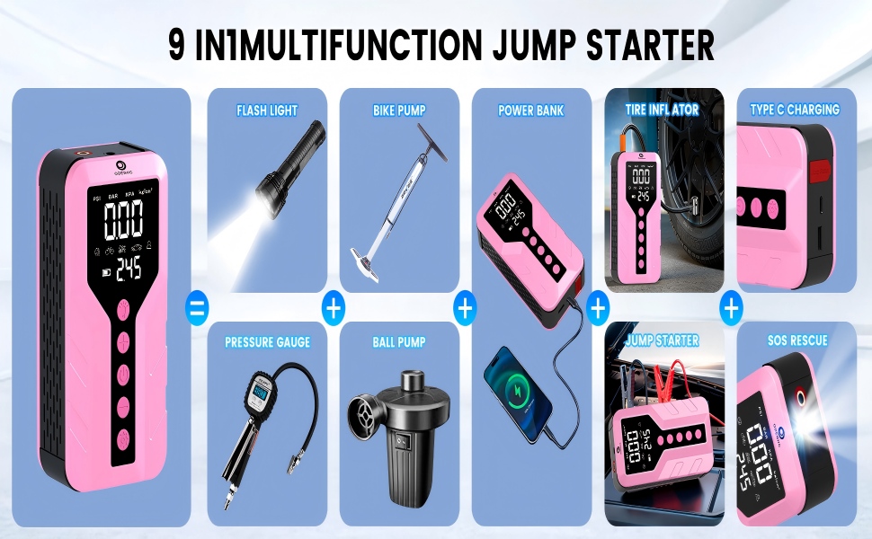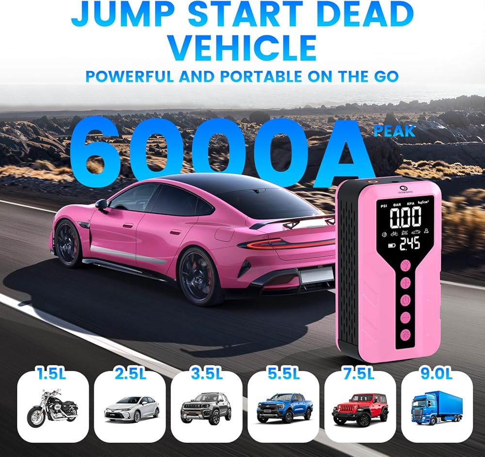 6000A Peak Jump Starter with Air Compressor - Portable Car Battery Booster for All Gas and 9.0L Diesel Engines, 150PSI Tire Inflator, LED Light, Type-C Light Pink