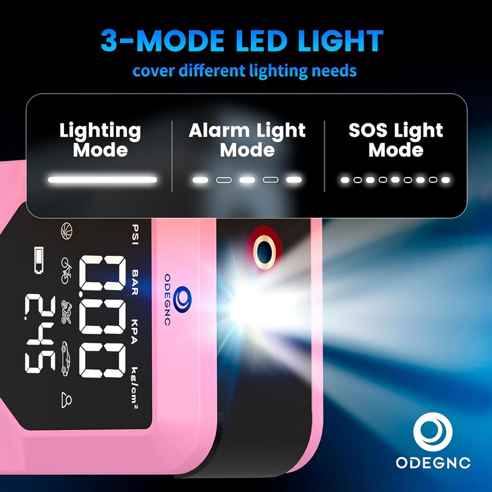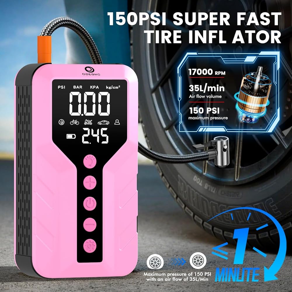 Digital, Fast & Hands-Free Inflation – The built-in 150PSI high-pressure air compressor features a digital gauge and auto-stop. Inflate a car tire (32 PSI) in ~1 minute. Perfect for tires, bikes, sports balls, and inflatables