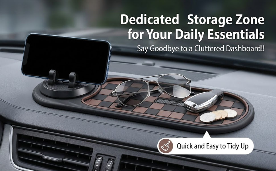 【منظم لوحة أجهزة القياس متعدد الوظائف】هذه السجادة متعددة الوظائف المضادة للانزلاق لا تحمل هاتفك بأمان فحسب، بل تحافظ أيضًا على الجزء الداخلي لسيارتك خاليًا من الفوضى. مع مساحات مخصصة للمفاتيح والعملات المعدنية والنظارات الشمسية والأقلام، تعمل كمنظم فعال للوحة القيادة، مما يوفر وصولاً سريعًا إلى أغراضك اليومية ويحافظ على سيارتك نظيفة ومرتبة
