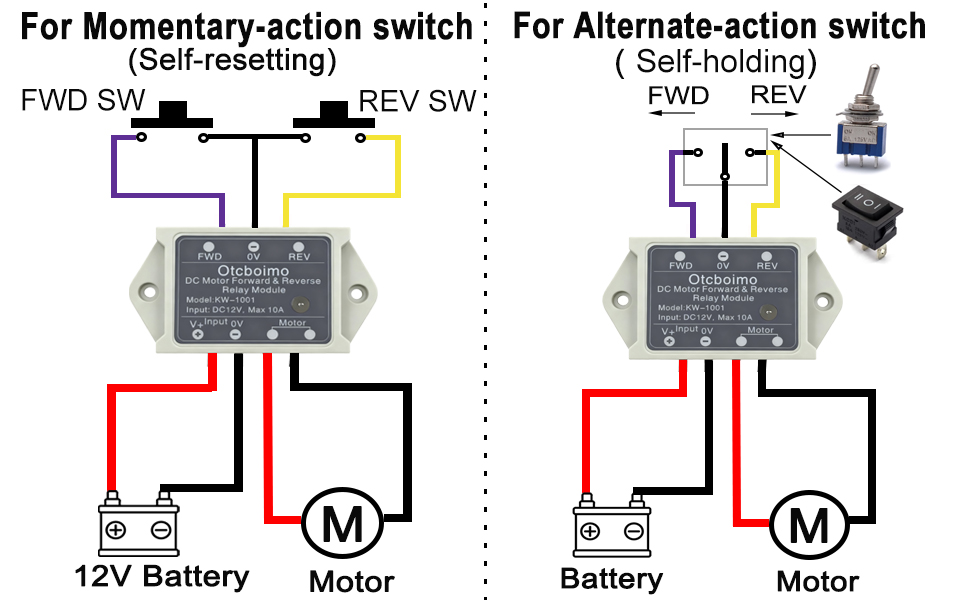 Supports Two Switch Types - Works with both Momentary-action (self-resetting) and Alternate-action (self-holding) switches. With a self-resetting switch, the motor runs only while pressed; with a self-holding switch, one press starts and another press stops.