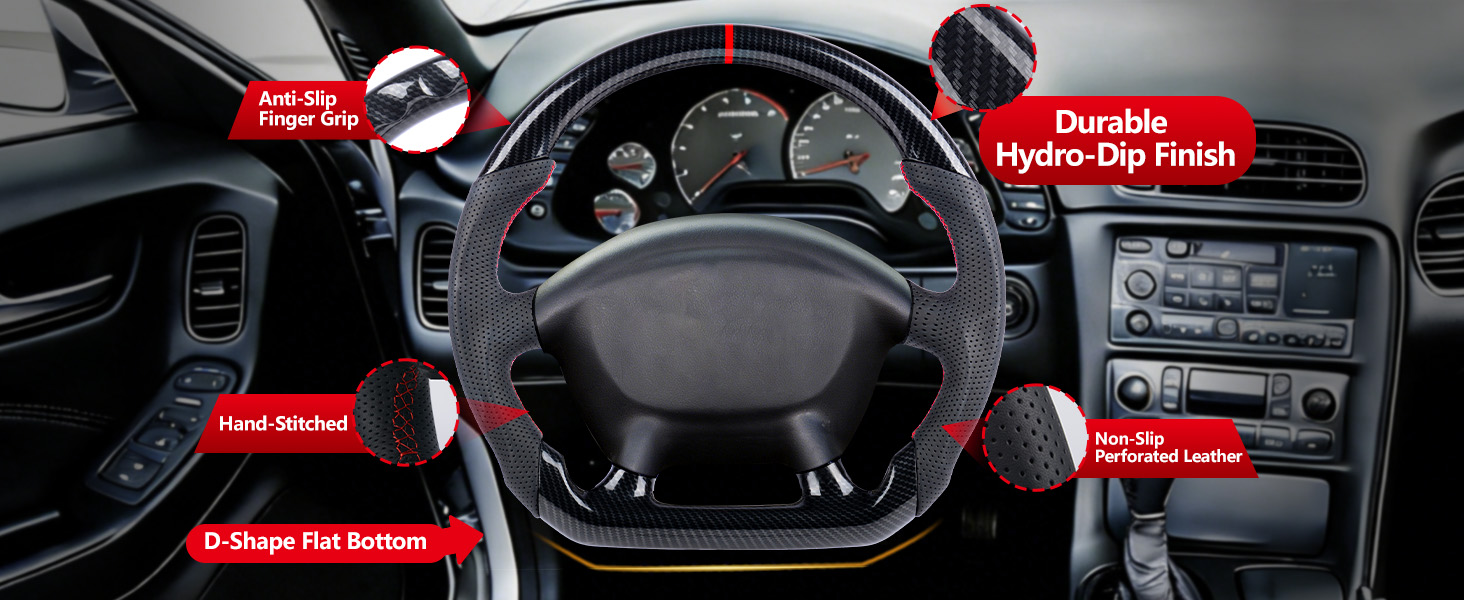 [Glossy Carbon Fiber Style Finish] Features a premium Hydro-Graphic (Water Transfer) coating that replicates the high-tech woven look of real carbon fiber. Sealed with a multi-layer high-gloss clear coat, it offers extreme UV resistance and a mirror-like shine that instantly modernizes the dated 90s interior aesthetics. (Note: This is a hydro-dip finish, not real carbon fiber).