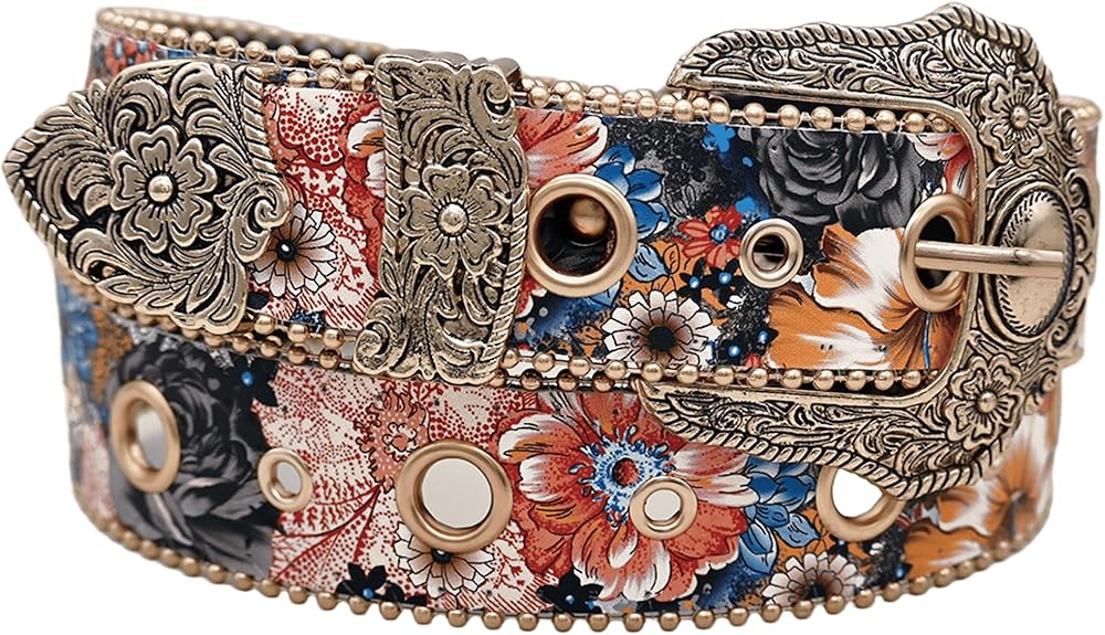 Women's Floral Western Belts with Vintage Carved Buckle Spring Summer Festival Cowgirl Belt for Country Jeans Fit for Waist from 25 to 40 in