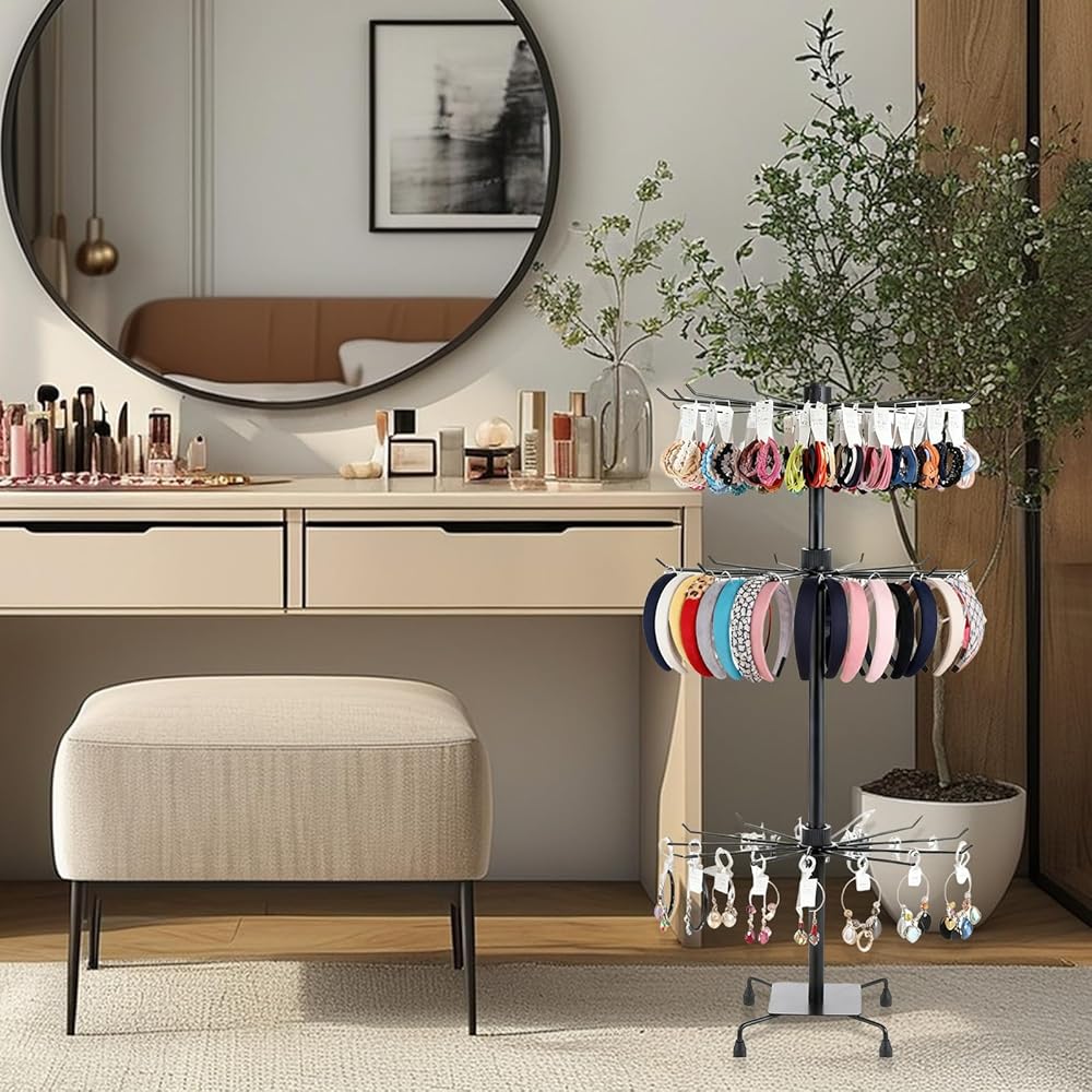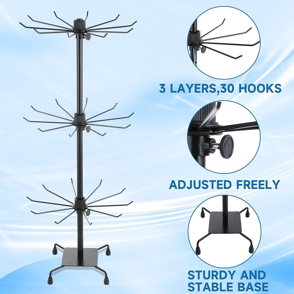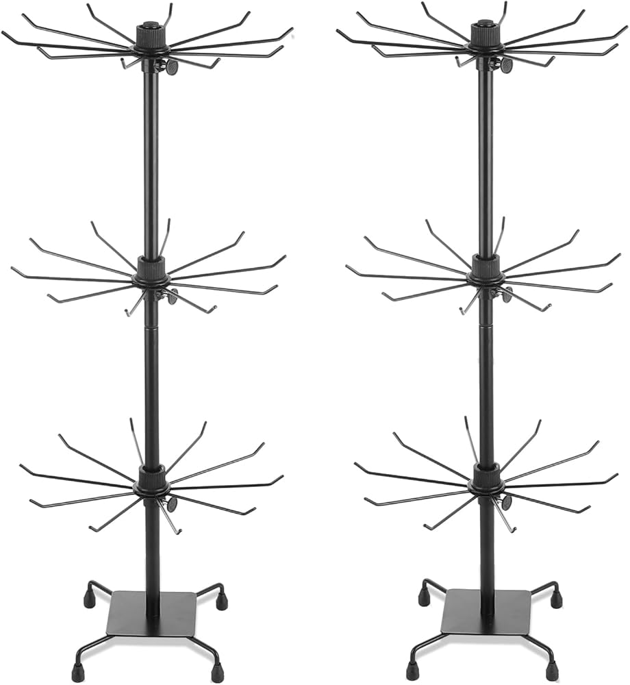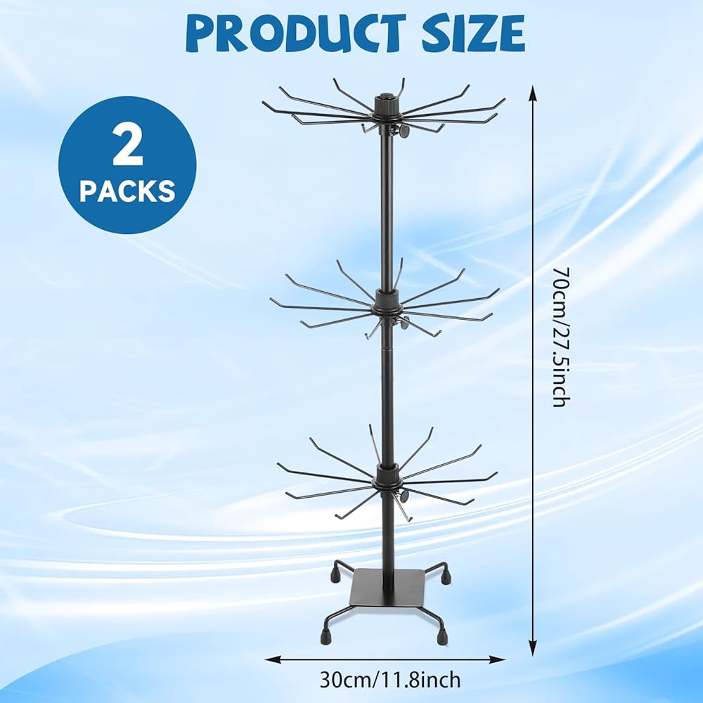 This 2-pack of rotating jewelry display stands offers versatile organization for business and home. Made of durable metal with a rust-resistant finish, each 27.5" tall keychain holder display stand spins smoothly for easy viewing. The jewelry display for vendors set includes 30 hooks, perfect for showcasing jewelry, keychains, or accessories at markets, stores, or in your bedroom. A practical, space-saving gift for sellers and organizers.