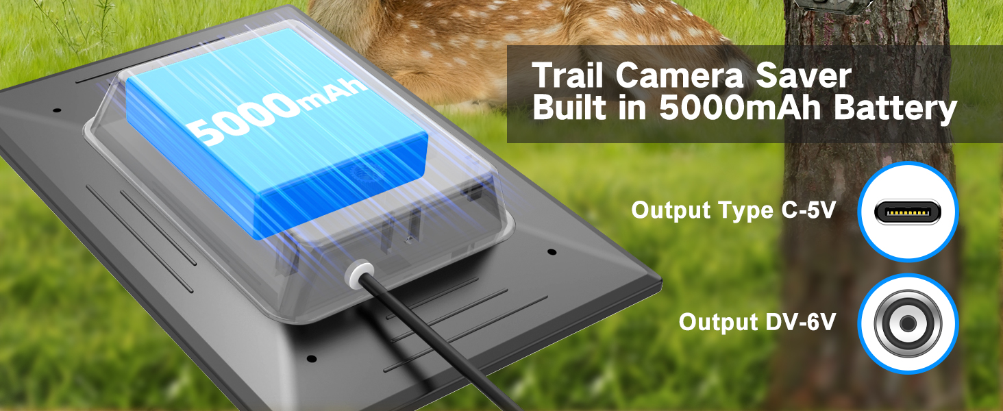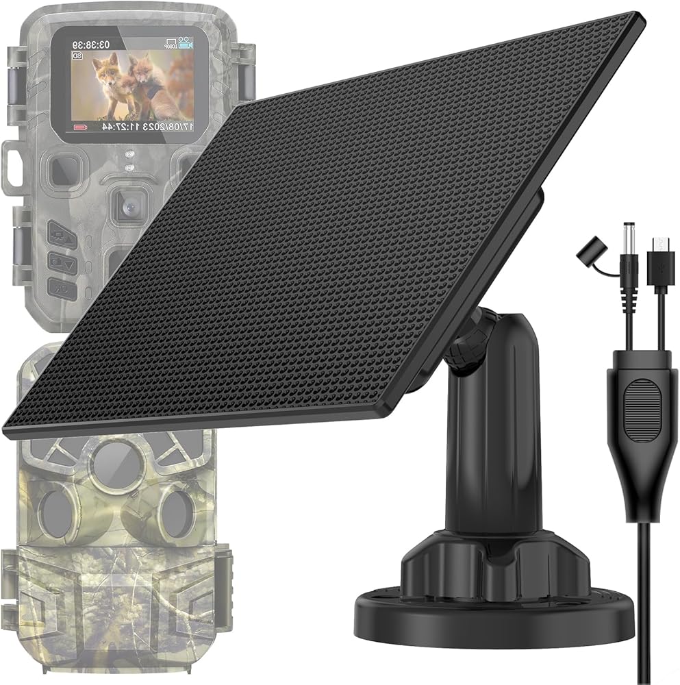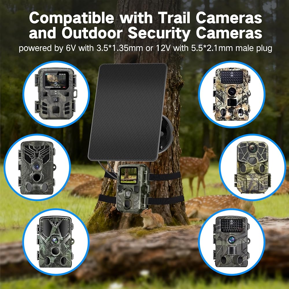 【Perfect Compatibility】This trail camera solar panel is specifically designed for hunting cameras, compatible with devices featuring Type C & DC connectors. It supports 5V/6V output specifications, making it suitable for the vast majority of trail cameras and tracking cameras on the market. (Please verify connector compatibility with your trail camera before purchase.)
