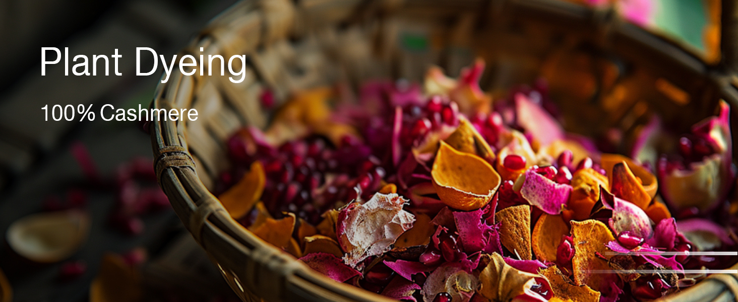 PLANT-DYED COLORS: Our plant-dyed cashmere shawls without any of chemical fixatives; we using biological enzymes fix the color, that's make the clothes are brightly and not easy to fade after washing. Khaki and light gray from pomegranate; The blue color comes from logwood; The purple color comes from comfrey; the Watermelon red comes from madder; The dark gray and black comes from the gall nut. Since the color comes from plants, each batch of yarn will have a slight color difference.
